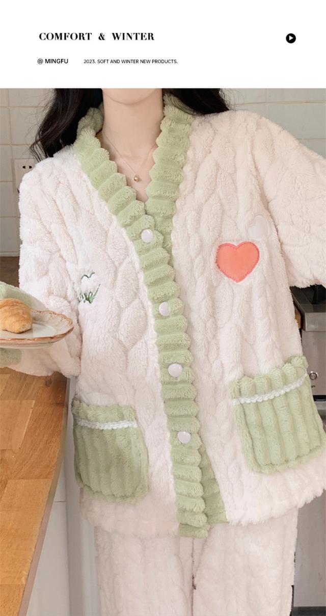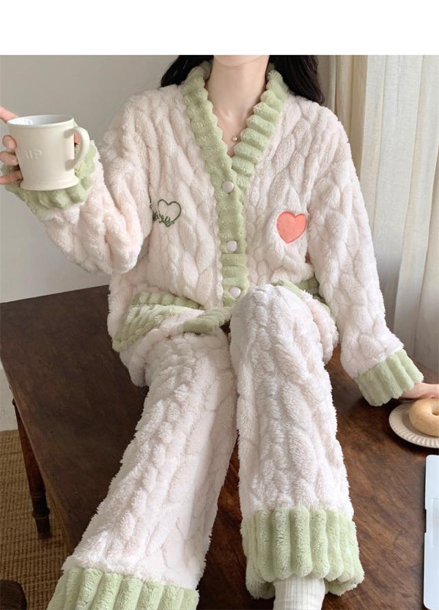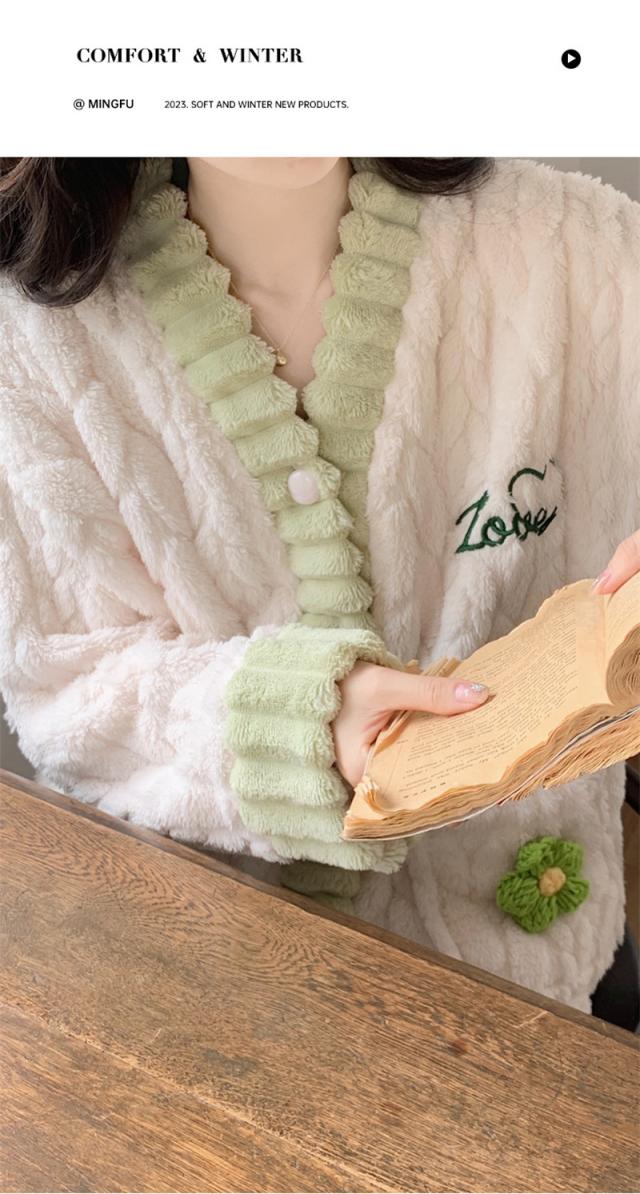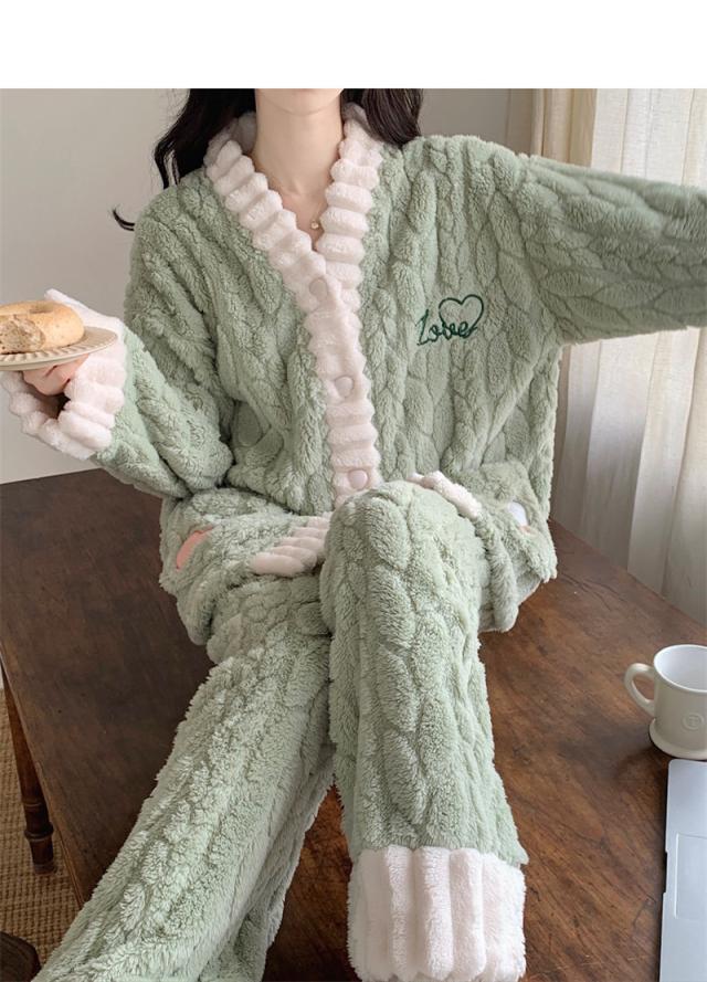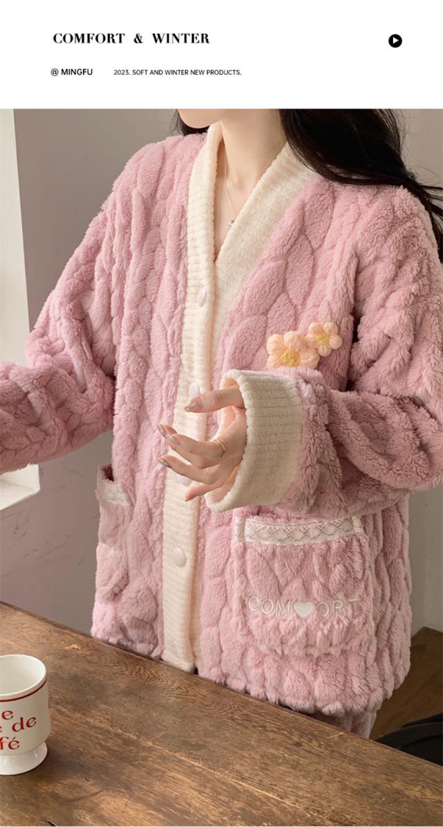 パジャマ レディース ルームウェア 上下セット 厚手 前開き モコモコ Vネック 長袖 長ズボン ナイトウェア フランネル 防寒