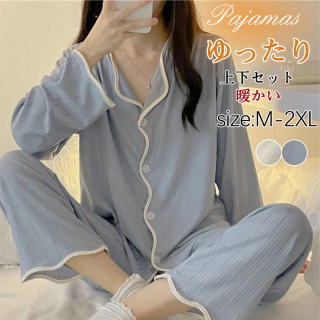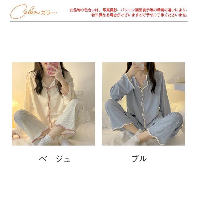 パジャマ レディース ルームウェア 上下セット 長袖 前開き 折り襟 長ズボン ナイトウェア 暖か シンプル 薄手 軽量 寝間着