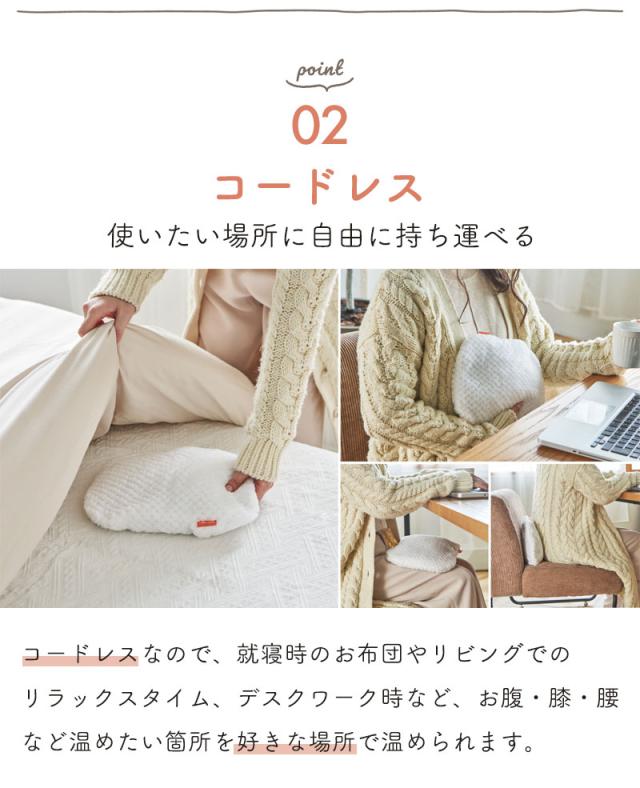 コードレスなので、就寝時やリビングでのリラックスタイム、デスクワーク時など、お腹・膝・腰など温めたい箇所を好きな場所で温められます。