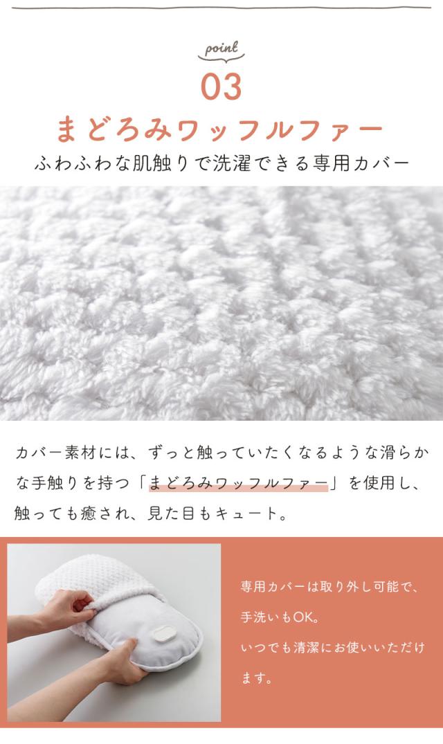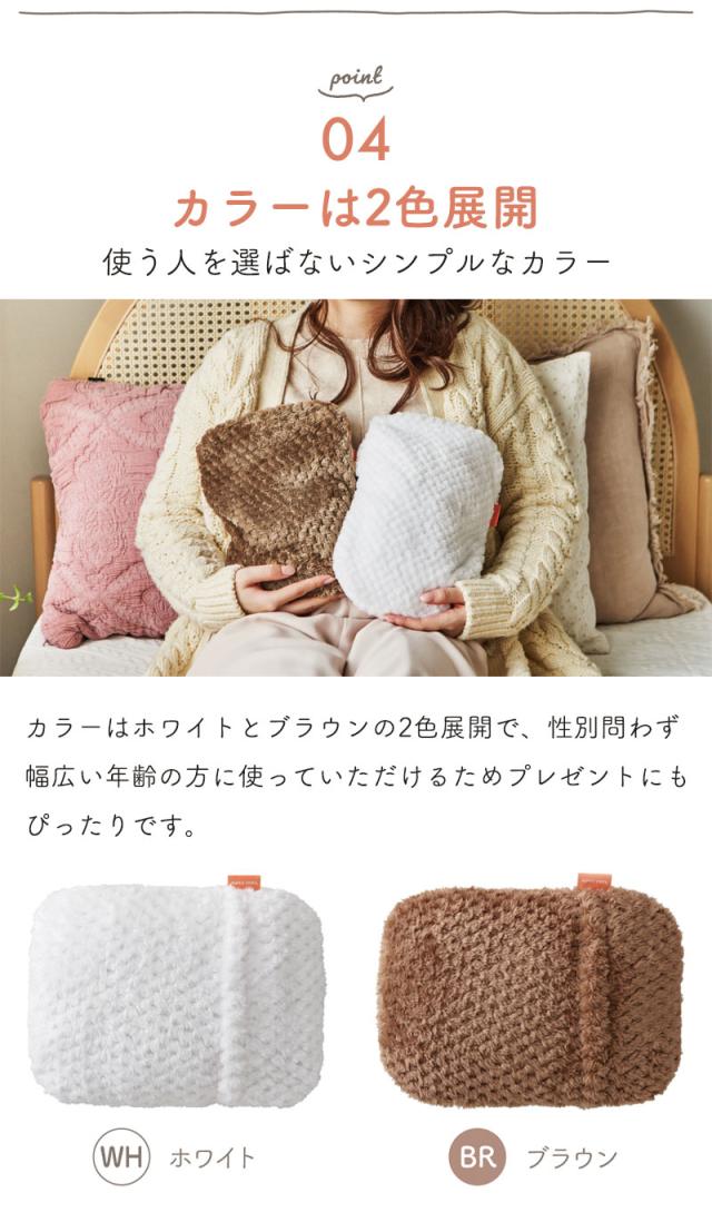 | 面倒な湯沸かし、お湯の交換不要で繰り返し使える、電気の力で蓄熱する湯たんぽ。 従来のお湯を入れるタイプの湯たんぽと異なり、お湯の入れ替え・湯沸かし不要で電気の力を用いて本体に蓄熱して繰り返し使うことができます。 蓄熱方法は本体を蓄熱アダプターに15分程繋ぐだけ、これで3時間以上も温かさが続きます。 この蓄熱作業にかかる電気代は1回あたりわずか約2円と電気代が高騰する冬に嬉しいアイテム。 カバー素材には、ずっと触っていたくなるような滑らかな手触りを持つ「まどろみワッフルファー」を使用し、触っても癒され、見た目もキュート。 専用カバーは取り外し可能で、手洗いもできます。 コードレスなので、就寝時やリビングでのリラックスタイム、デスクワーク時など、お腹・膝・腰など温めたい箇所を好きな場所で温められます。 カラーはホワイトとブラウンの2色展開で、性別問わず幅広い年齢の方に使っていただけるためプレゼントにもぴったりです。 |