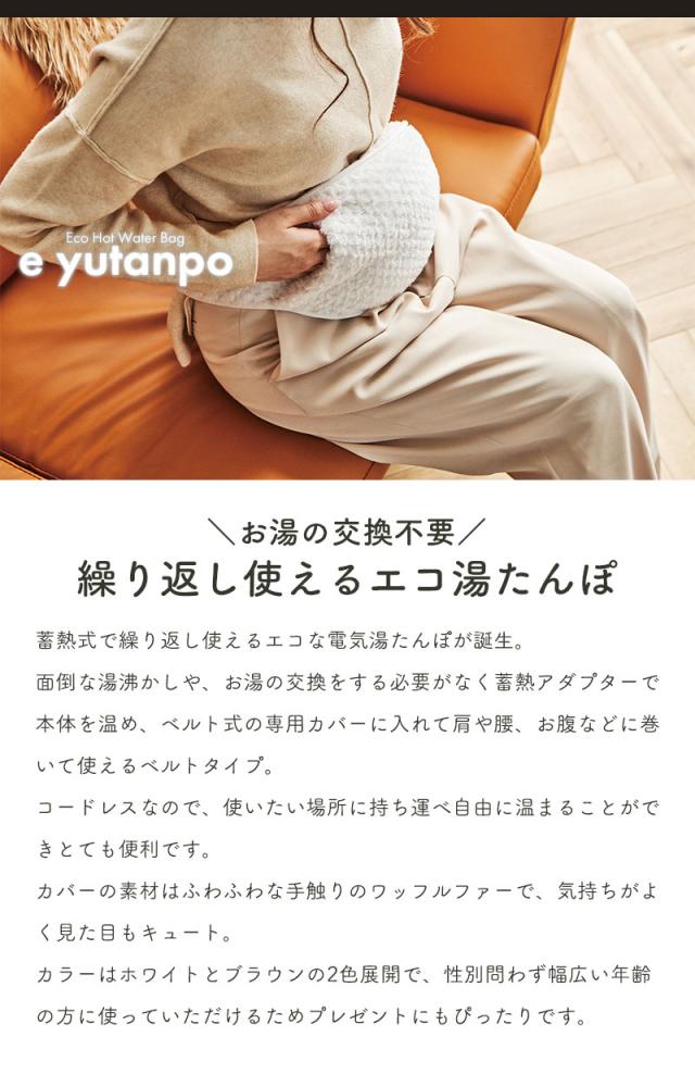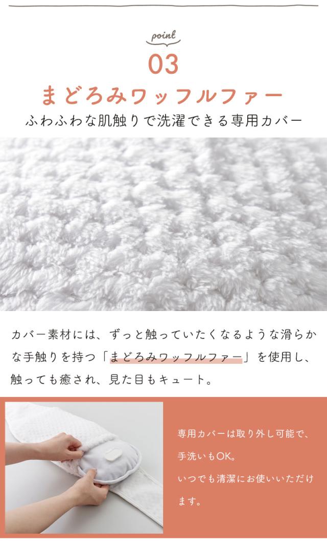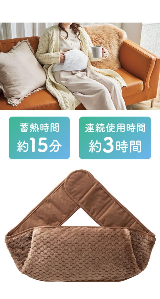 | 面倒な湯沸かし、お湯の交換不要で繰り返し使える、電気の力で蓄熱する湯たんぽ。 従来のお湯を入れるタイプの湯たんぽと異なり、お湯の入れ替え・湯沸かし不要で電気の力を用いて本体に蓄熱して繰り返し使うことができます。 蓄熱方法は本体を蓄熱アダプターに15分程繋ぐだけ、これで3時間以上も温かさが続きます。 この蓄熱作業にかかる電気代は1回あたりわずか約2円と電気代が高騰する冬に嬉しいアイテム。 ベルト式の専用カバーに入れて肩や腰、お腹などに巻いて使えるベルトタイプ。 ベルトの長さは約120cmとロングタイプなので、男女問わず様々な体格の方に対応。 カバー素材には、ずっと触っていたくなるような滑らかな手触りを持つ「まどろみワッフルファー」を使用し、触っても癒され、見た目もキュート。 専用カバーは取り外し可能で、手洗いもできます。 コードレスなので、就寝時やリビングでのリラックスタイム、デスクワーク時など、お腹・膝・腰など温めたい箇所を好きな場所で温められます。 カラーはホワイトとブラウンの2色展開で、性別問わず幅広い年齢の方に使っていただけるためプレゼントにもぴったりです。 |