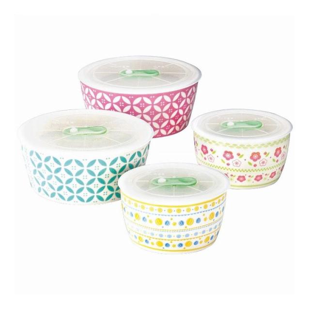 直径12.8cm高さ5.5cm容量約430mlパック(M)・直径9.8cm高さ5.7cm容量約260mlパック(S)各2客(各2柄)・磁器・フタ:ポリプロピレン、熱可塑性エラストマー・7127-038