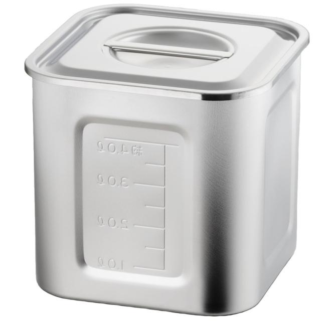 サイズ:内径105x105xH105mm<br>本体重量:約305g<br>素材・材質:21-0ステンレス(SUS443 J1)<br>原産国:日本/燕市<br>本体板厚:0.6mm<br>容量:約1.1L<br>◆商品名:AG 21-0 目盛付 角型キッチンポット 10.5cm (手無)<br>商品紹介<br>タレ・調味料等の保存や小分けに便利。角型なのでスペースを有効に使えます。