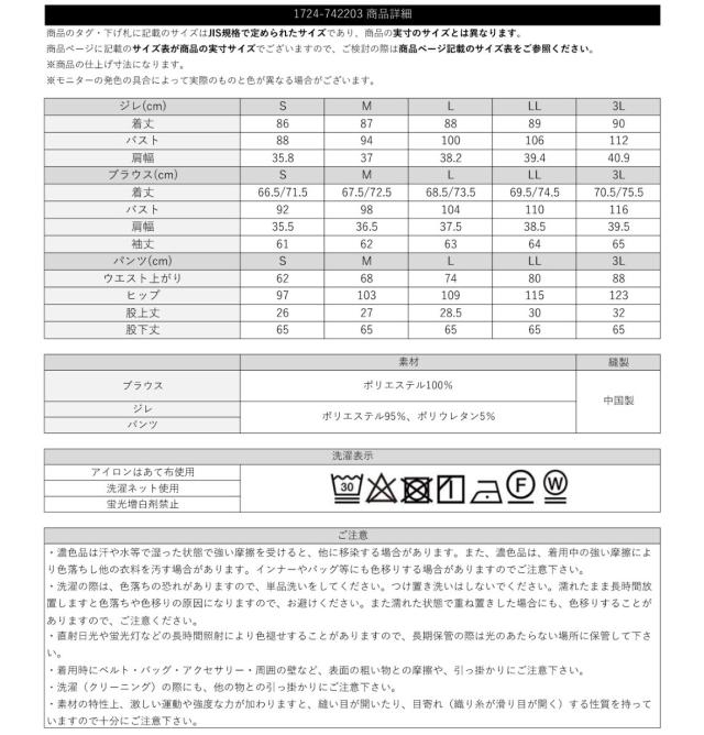 ■素材:(ブラウス)ポリエステル 100%、(ジレ・パンツ)ポリエステル 95%、ポリウレタン 5%