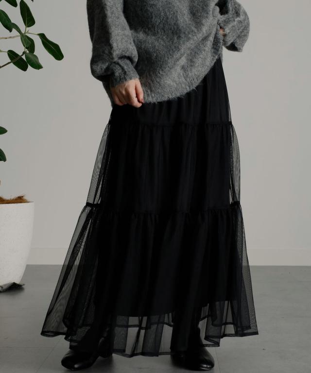 チュールのやさしい透け感を楽しむティアードスカート。着太りを回避してくれるハリ感控えめの生地を選び、適度なボリュームで落ち感のある大人シルエットに。