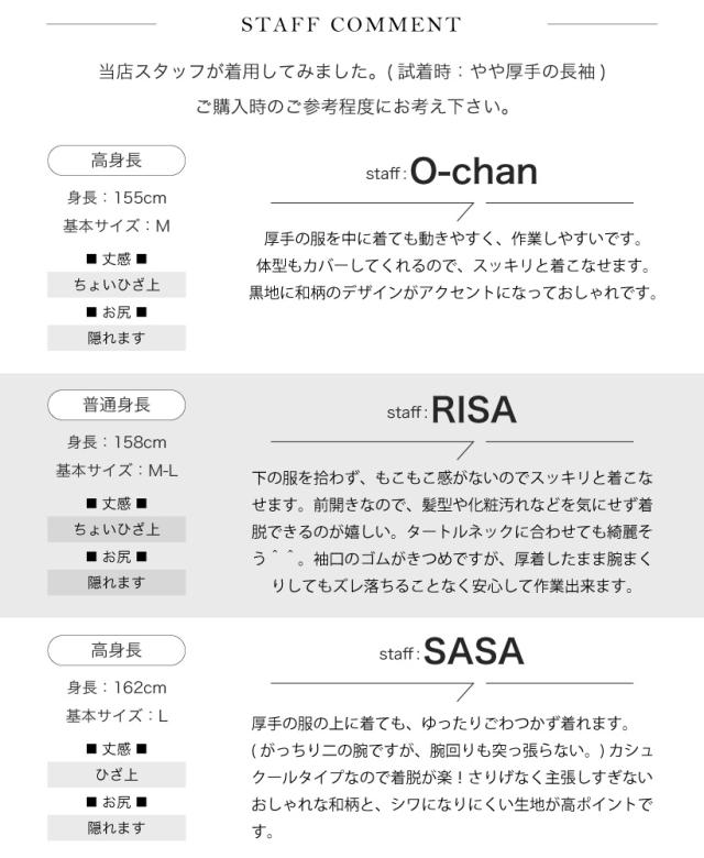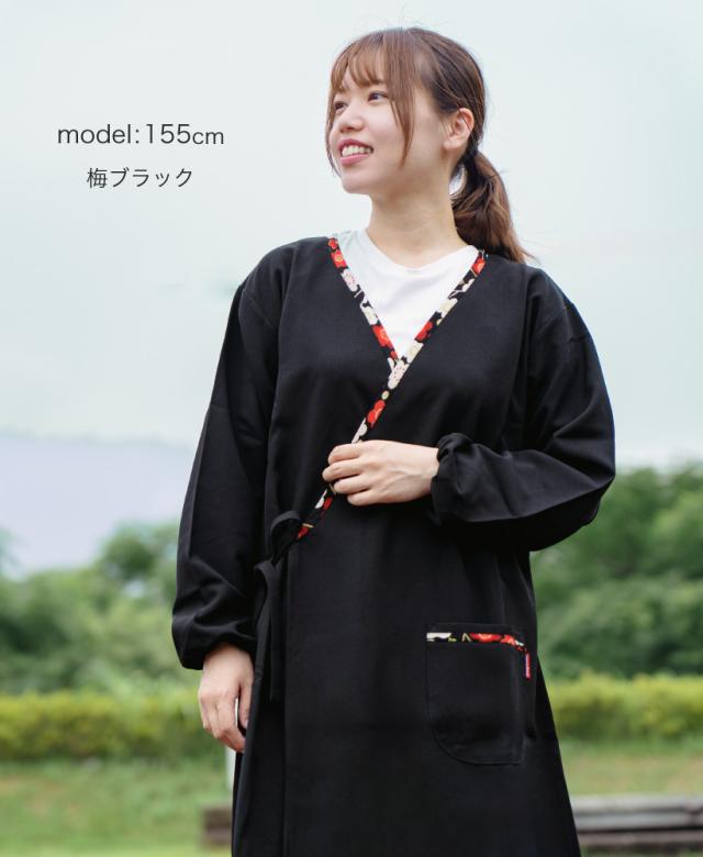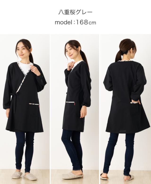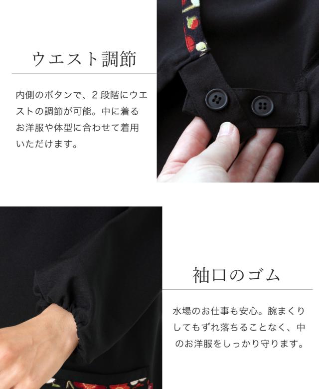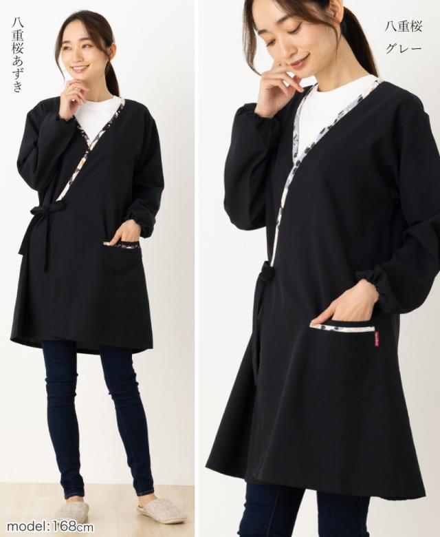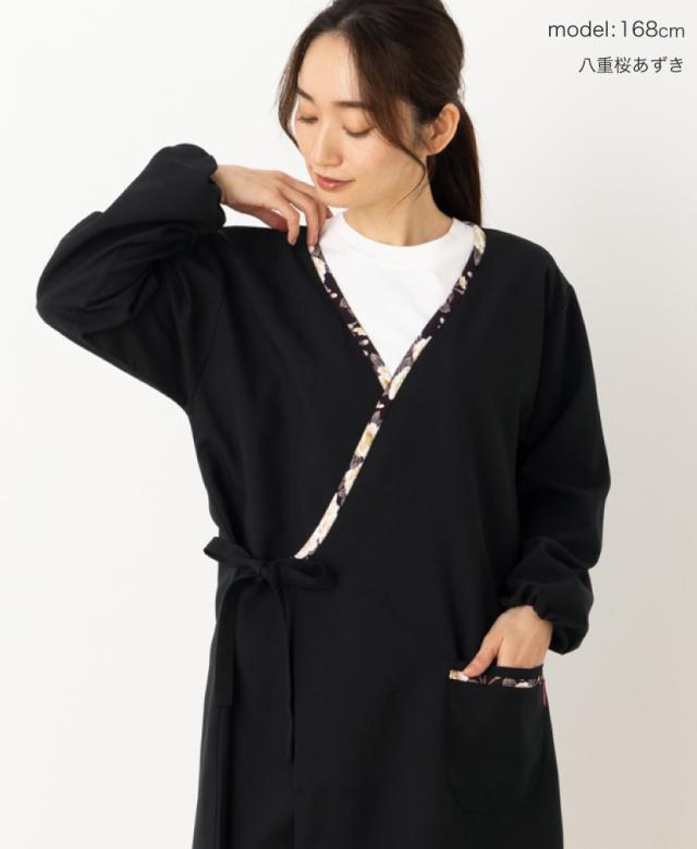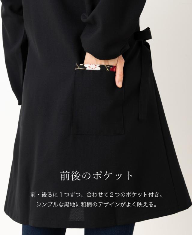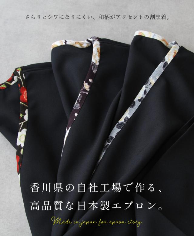 前開きで着脱しやすい、カシュクール風割烹着。シンプルな黒地に和柄が映える大人なデザイン。本体にさらりと柔らかなポリエステル生地を使用し、シワになりにくくお手入れもラクチン。香川県の工場で1枚1枚丁寧に縫製した、高品質なエプロンは大切な方へのプレゼントとしてもおすすめです。
