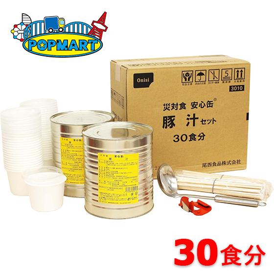 豚汁缶詰1号缶(3kg)×2缶、カップ(蓋付)30個、割箸30膳、缶切り1個、おたま1本、取扱説明書