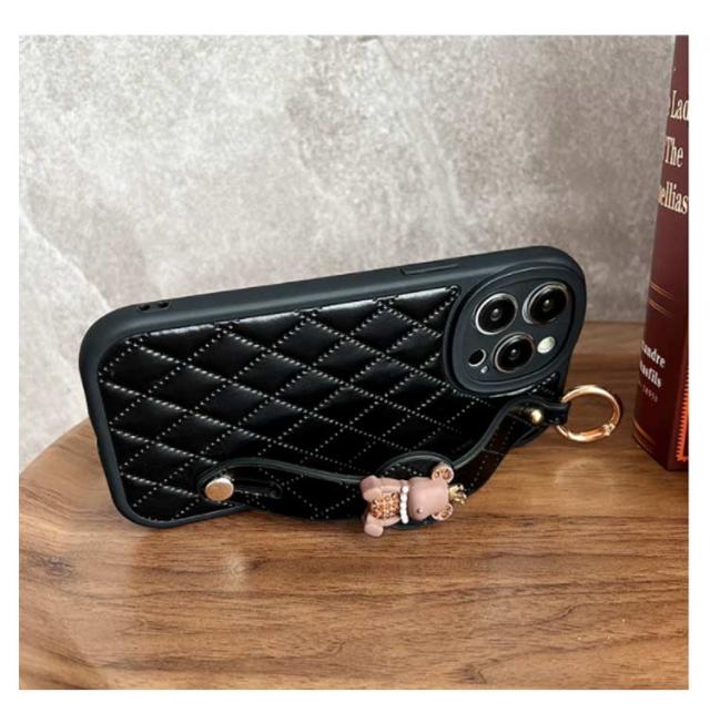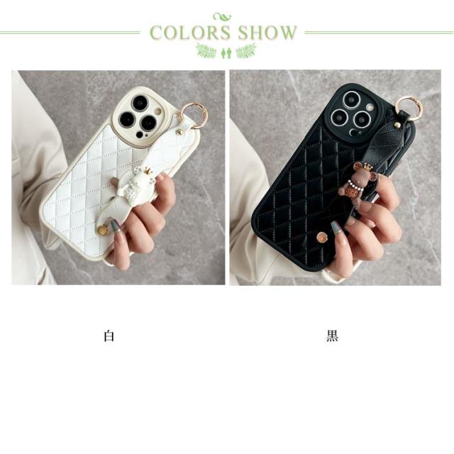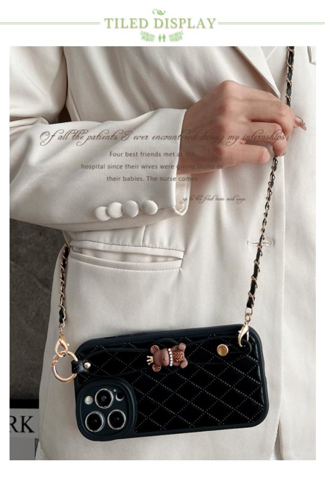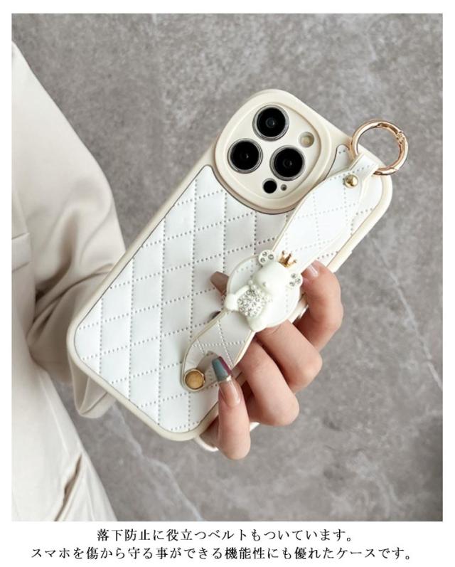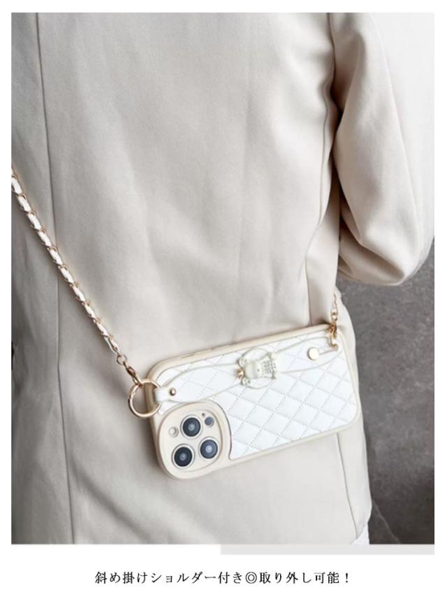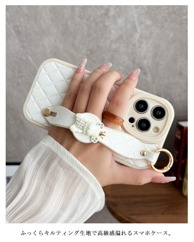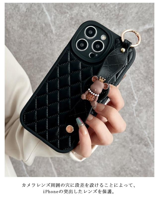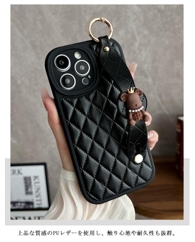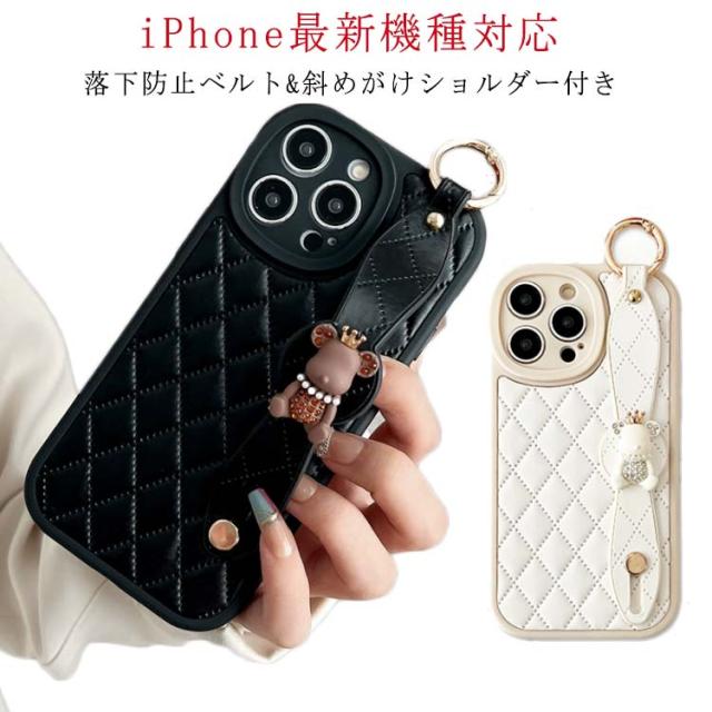 肩掛け ストラップ チェーン付きキルティング スマホケース 落下防止 ベルト付き 斜めがけ ショルダー iPhoneケース くま バンド付き iPhone15 ケース 衝撃保護 スマホカバー キルティングケース