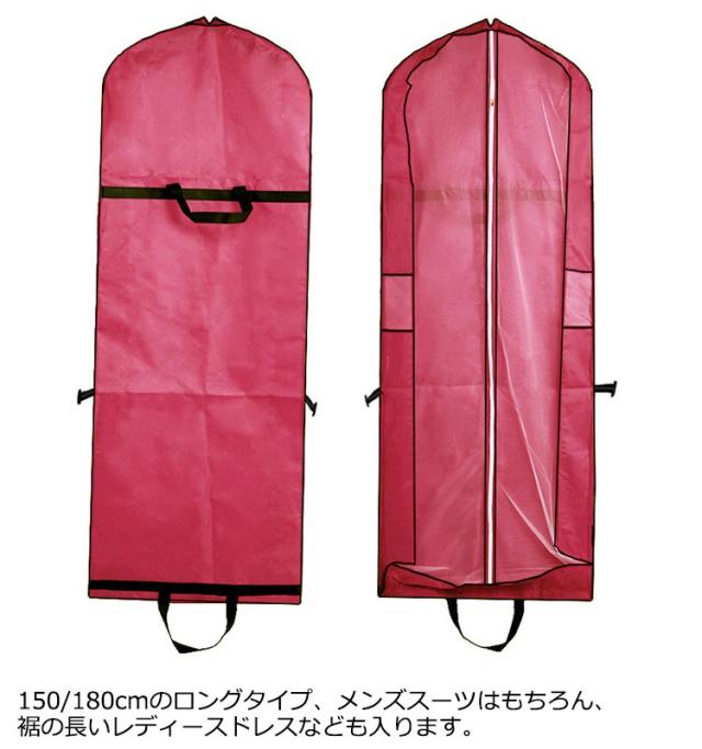 | フォーマルな衣類などを入れて持ち運べるドレスバッグです。 結婚式のウェディングドレスや、丈の長いドレスの収納などにもおすすめです。 まず、ハンガーにかけた状態のドレスを収納します。 三つ折りにして、ぐるっとファスナーで閉じればバッグの形に! ファスナーを開けておけば、ドレスカバーとしてもお使いいただけます。 そのままクローゼットに収納して、ほこりや汚れから守ってくれます。持ち手のついたバッグ型なので移動も楽々。 150/180cmのロングタイプ、メンズスーツはもちろん、裾の長いレディースドレスなども入ります。 | |