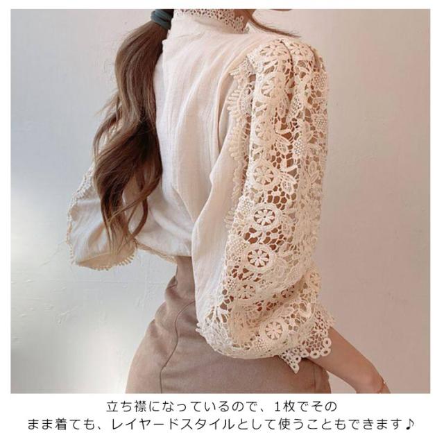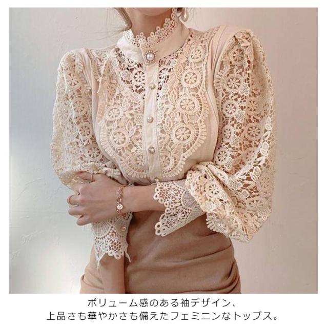 | 立体感ある上品なレースを使用し、ルーズなシルエットが着回しやすいレーストップスが登場! 程よい透け感と高級感のあるレースでこなれ感を演出してくれます。 胸元切替で裏地付きになっているのでインナーにも困らないデザインが嬉しいポイント! ボリューム感のある袖デザイン、上品さも華やかさも備えたフェミニンなトップス。 立ち襟になっているので、1枚でそのまま着ても、レイヤードスタイルとして使うこともできます♪ オケージョンからデイリーまで幅広いシーンで活躍すること間違いなしのレースアイテム。 | |