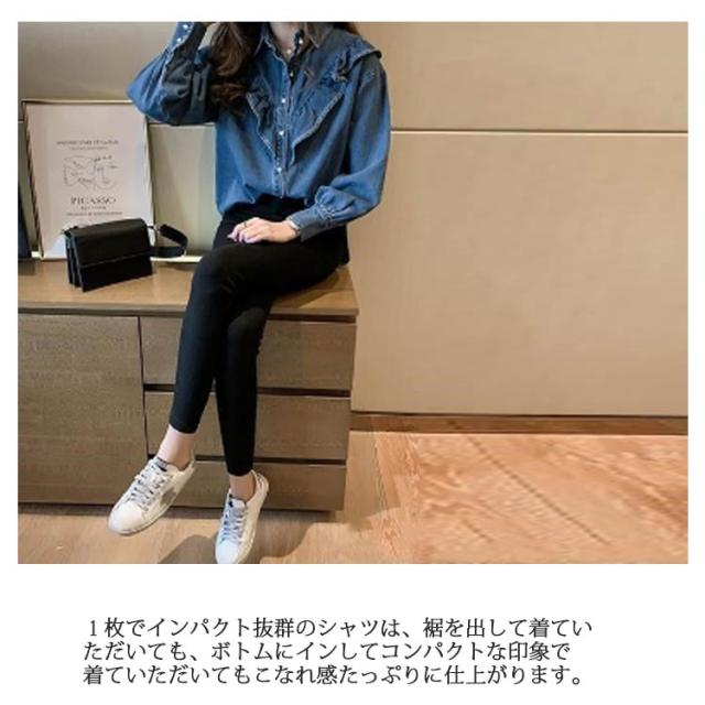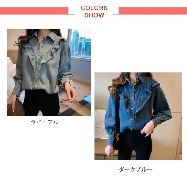 デニムフリルブラウス レディース トップス 長袖 シャツ ブラウス 羽織り フリルデニムシャツブラウス ラグランスリーブ デニム長袖シャツ 送料無料 かわいい カジュアル シンプル 無地 フリル 韓国ファッション デニムシャツ