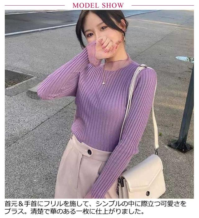 | ネックと袖口のフリル使いが可愛らしい!首元と手首のフリルがポイントのリブプルオーバー。 少し立ち上がったハイネック部分のフリルは、ボリュームを抑える事で甘さを低減。 袖口はリブのフィット感とフリルをMIXする事でメリハリが生まれ、手元まで抜かりのないお洒落を楽しむ事ができます。 身体のラインを拾いすぎず、程よいゆとりがあるので一枚でさらっと着るのも◎ カーディガンなどと合わせたガーリーなスタイルから、マニッシュなトレーナーと合わせたMIXコーデまでスタイルのアクセントになってくれるアイテムです。 | |