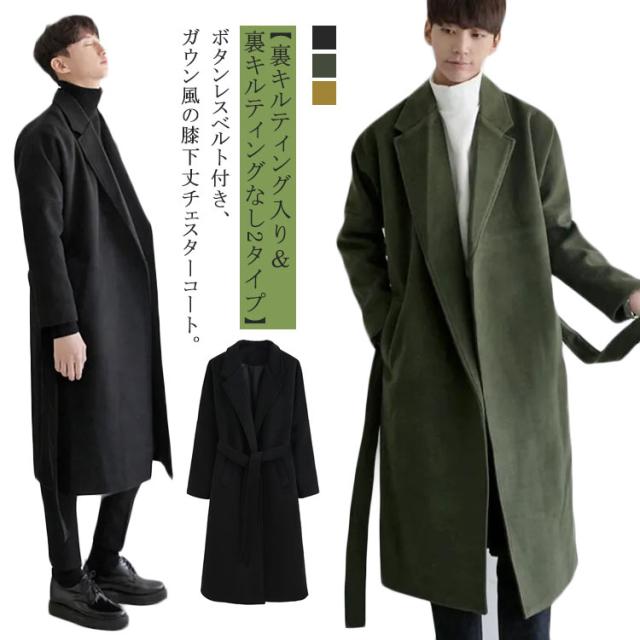 コート メンズ チェスターコート メルトン ロングコート 膝下丈 ベルト付き 秋 冬 キルティング入り 裏キルト 厚手 暖かい 防寒 保温 オーバーサイズ ボタンレス ガウン風 通勤 カジュアル 韓国 ファッション 大きいサイズ ブラック カーキ ベージュ