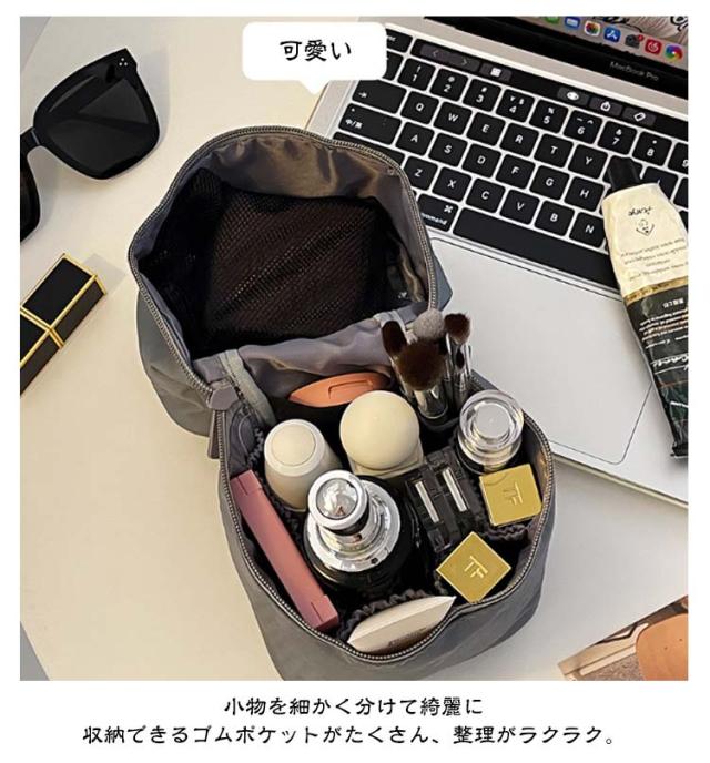 | たてに収納できるメイクポーチ♪ 化粧水からファンデまで横に倒したくない化粧品をそのまま旅先まで持って行ける縦型化粧ポーチ。 Wジッパーで大きく開き、何がどこにあるのかも一目瞭然。チューブや化粧水、化粧ブラシなども立てたまま入れられ、化粧品を取り出しやすく収納しておけます。 小物を細かく分けて綺麗に収納できるゴムポケットがたくさん、整理がラクラク。 取り外し可能なメッシュポーチ付きリップや香水、パウンダーなど入れて、持ち歩きポーチに活用可能。 フタ裏の透明ポケットはサンプル、綿棒、ピンセット、眉ハサミなどの収納に便利。 | |