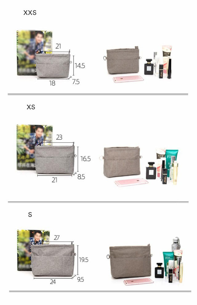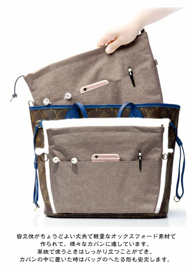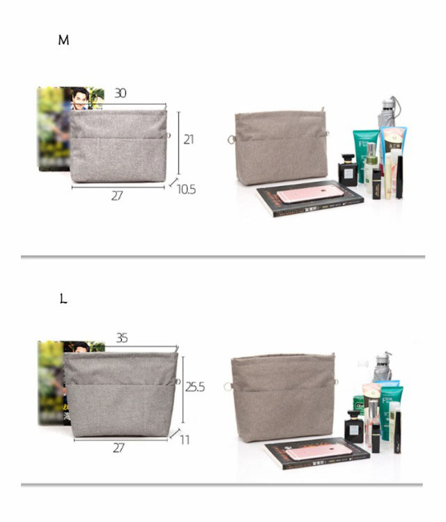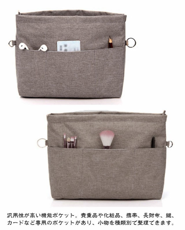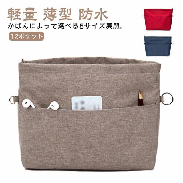 | かばんによって選べる5サイズ展開。 ファスナー付き自立式バッグインバッグ。 自立性がちょうどよい丈夫で軽量なオックスフォード素材で作られて、様々なカバンに適しています。単独で使うときはしっかり立つことができ、カバンの中に置いた時はバッグのへたる形も安定します。 仕切り12個で鞄の中整理整頓。ゴチャゴチャしているバッグの中がすっきりと片付きます。インバッグだけで相当な小分け収納量があるので、ポーチを断捨離出来るほど便利です。 汎用性が高い機能ポケット。貴重品や化粧品、携帯、長財布、鍵、カードなど専用のポケットがあり、小物を種類別で整理できます。 盗難防止/中身隠す。ファスナーで上部が閉じられて中身が見えなくなり、通勤時の満員電車でも心配ありません。倒れても小物が落ちないし、そのままカバンから取出して化粧室で使用にも便利です。中にも貴重品用のチャックポケットが一つあります。 キーストラップ付きで、よく使う鍵をなくしたりする心配もありません。 バッグを変えたい時便利。一つにまとめることができ、出かける際にそのまま別のバッグに入れ替えられで便利です。防水素材は通勤、通学、買い物、旅行や出張の時に鞄を汚れから守ります。 | |