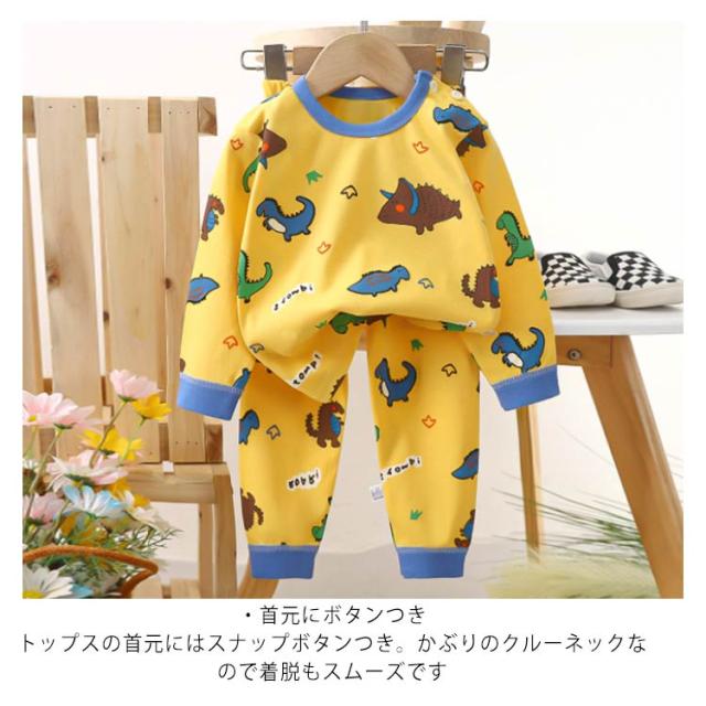 | キッズパジャマ 70~130cm ・可愛いイラストのプリント柄 毎日の就寝時に!長袖 長ズボンがセットアップになった可愛いパジャマ登場! 寝巻き、部屋着からお泊り保育まで。兄弟お揃いにもできる豊富なサイズ展開♪ ・便利なリブ仕様 袖口と裾口がリブなのでずり落ちにくく、寝ている時のめくれ上がり防止に 少し大きめでも折り返して長く着ることもできちゃいます ・コットンにこだわりました 程よい厚みなので春夏、秋冬問わずオールシーズン使えます ・首元にボタンつき トップスの首元にはスナップボタンつき。かぶりのクルーネックなので着脱もスムーズです | |