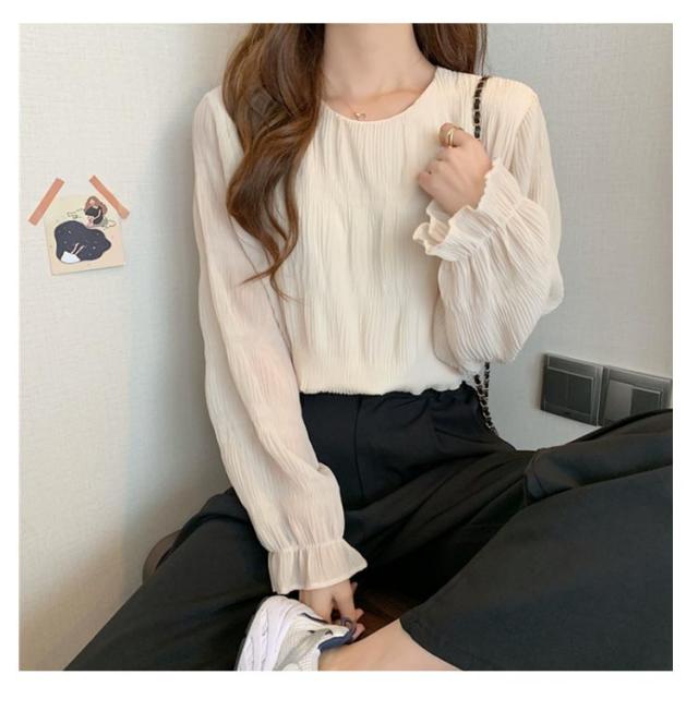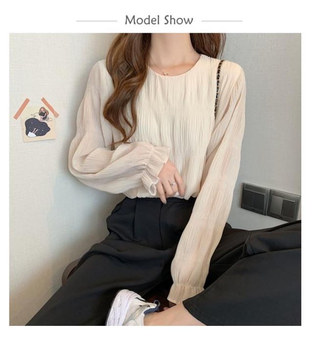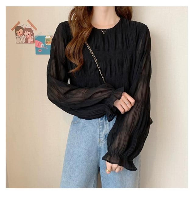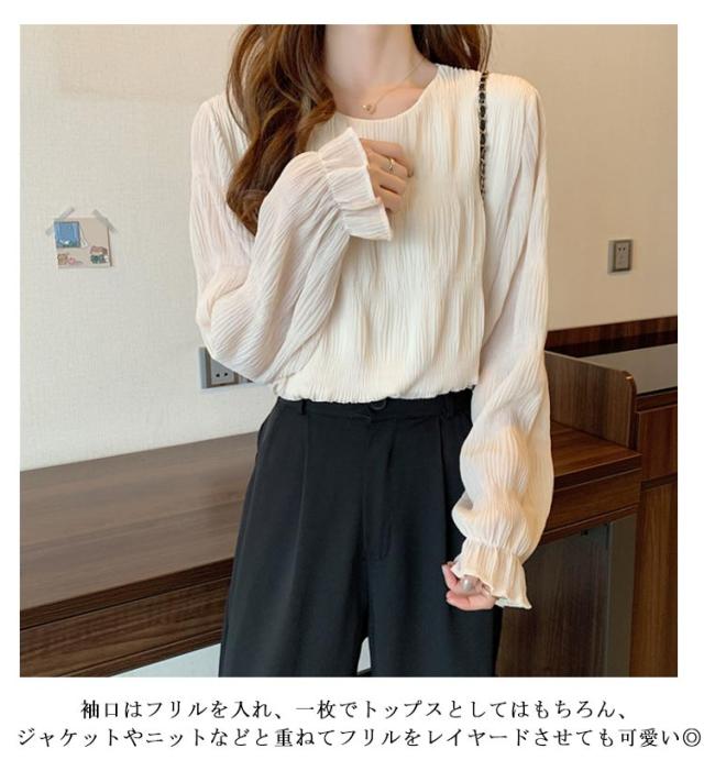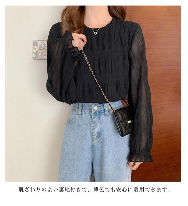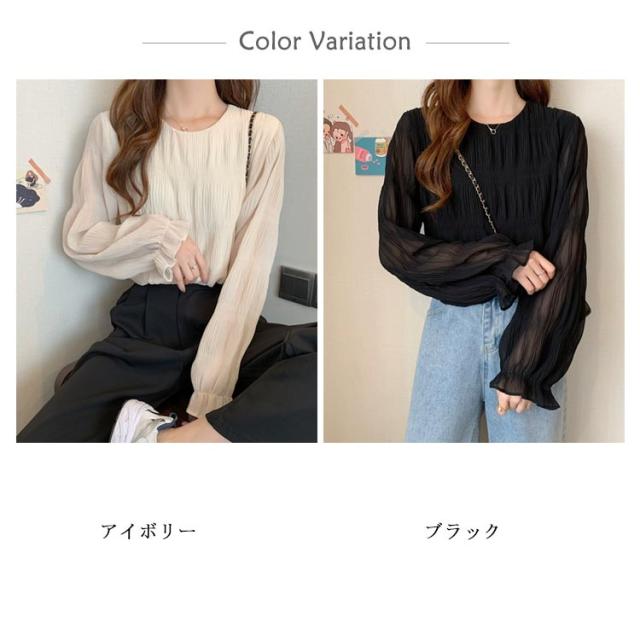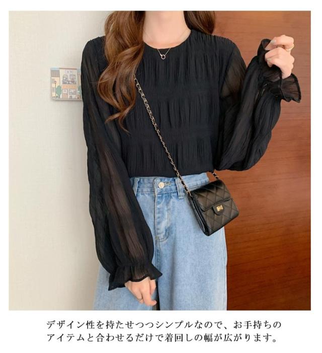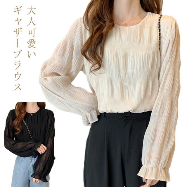 ブラウス ギャザーブラウス トップス プルオーバー レディース 長袖 春秋 冬 クルーネック ラウンドネック かわいい きれいめ 重ね着 シャーリング 透け感 シアー フリル フレア袖 大人可愛い