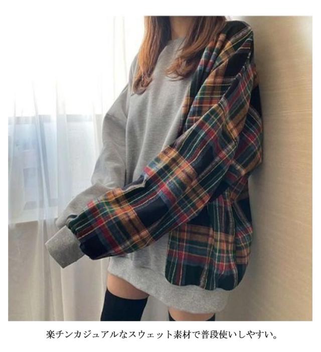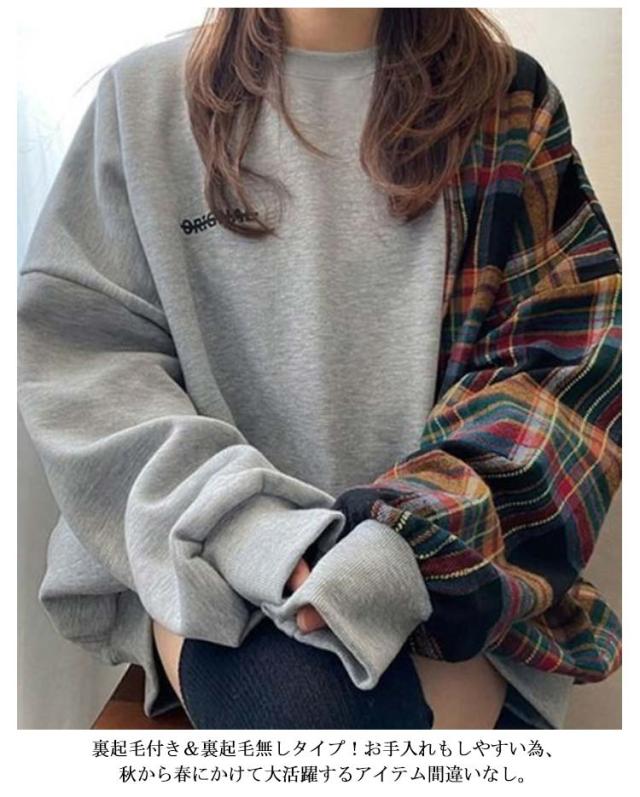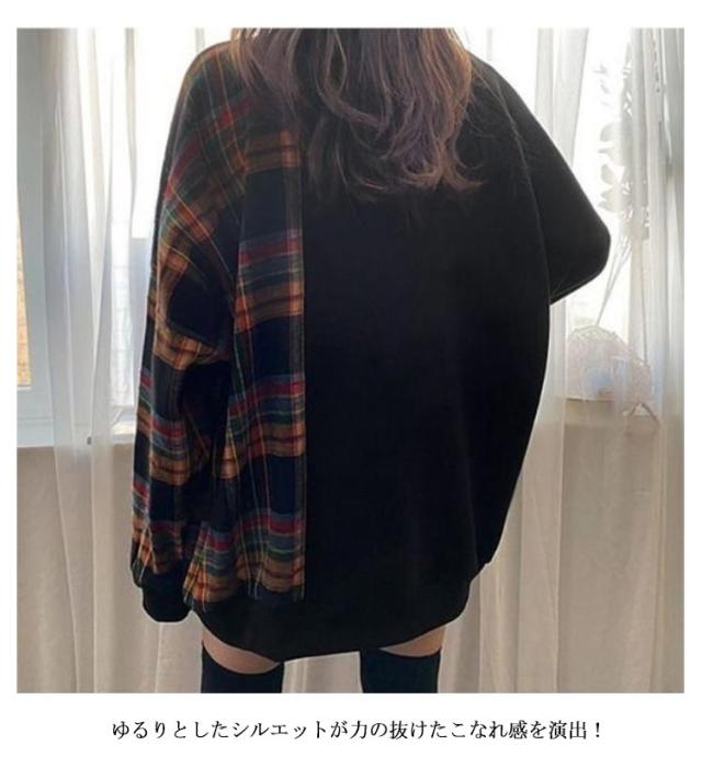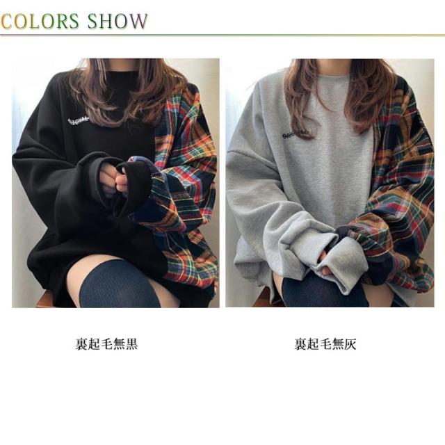 異素材 トップス レディース パーカー 長袖パーカー 秋冬 フードなし プルオーバー トレーナー トップス ゆったり オーバーサイズ 大人 チェック柄 切り替え 裏起毛あり 裏起毛なし 体型カバー M L XL 2XL 3XL