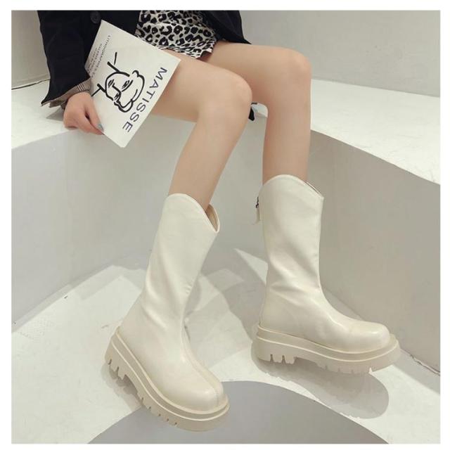 ロングブーツ ジョッキー ブーツ レディース 厚底 ストレッチ ロングブーツ PUレザー ラウンドトゥ プラットフォーム トラックソール バックジップ 疲れない やわらか 柔らかい 歩きやすい 軽量 大きいサイズ 防寒 滑りにくい 美脚