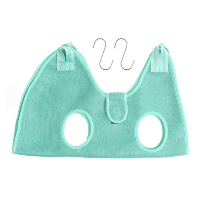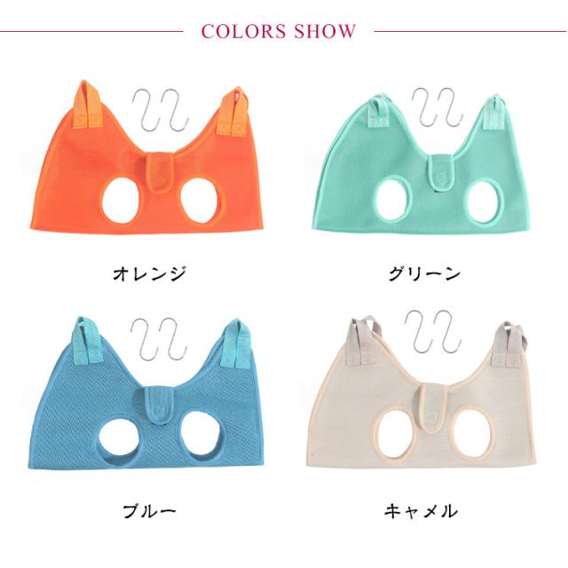 | 【猫・小型犬〜大型犬まで対応】 【グルーミングハンモック】 通気性の良いメッシュ生地を使用 ホール周りはクッション性があり肌にやさしいのが◎ 使用シーン:爪切り、トリミング、目薬、耳掃除 使用方法: ・床や机に本体を広げ ・わんちゃんの脚を4か所の穴に通るようにし ・包み込むような形で両端の輪にS字フックを通し ・持ち上げ、ポールなどにフックをひっかけて準備完了! | |