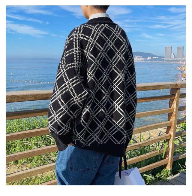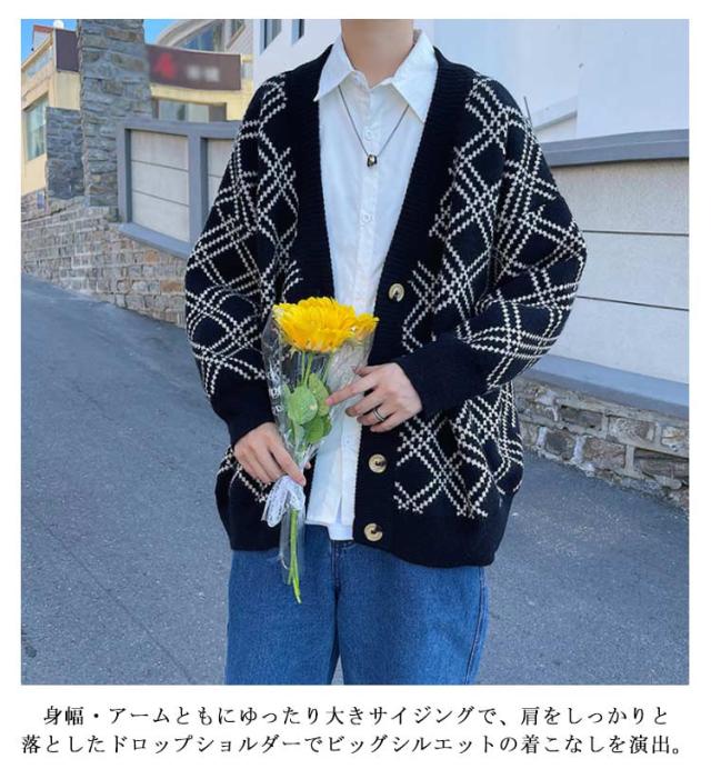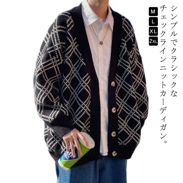 ニット カーディガン チェック柄 総柄 メンズ 秋 冬 厚手 ニットカーディガン Vネック アーガイル柄 ニット カーデ 羽織り アウター オーバーサイズ ルーズ 秋物 秋服 韓国風 ストリート カジュアル おしゃれ シンプル 大きいサイズ ブラック 黒
