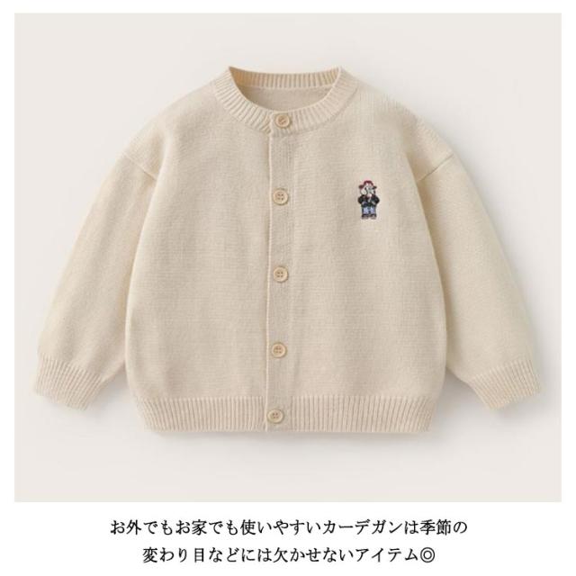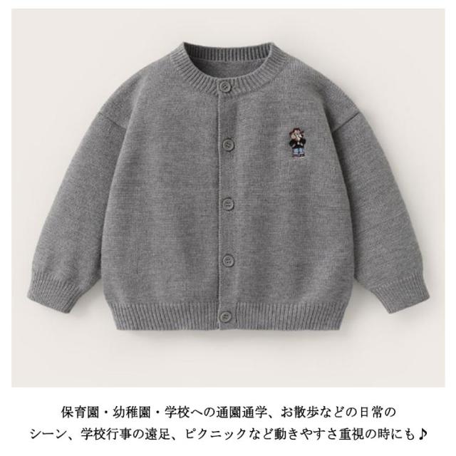 | シンプルで着まわしやすく、1着持っておくと便利なシンプルニットカーディガン。 程よい厚さの素材感で、秋口にはさらっと気軽に羽織るライトアウターとして、冬のインナーとして、ロングシーズン着用いただける万能アイテム。 大きめサイズを選んで、ボタンを閉めてゆるっと着ても可愛いです! お外でもお家でも使いやすいカーデガンは季節の変わり目などには欠かせないアイテム◎ 保育園・幼稚園・学校への通園通学、お散歩などの日常のシーン、学校行事の遠足、ピクニックなど動きやすさ重視の時にも♪ | |