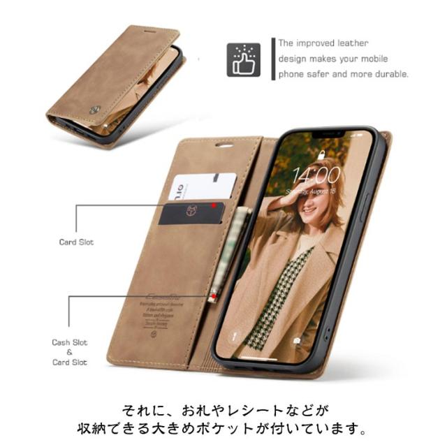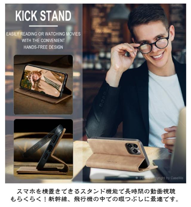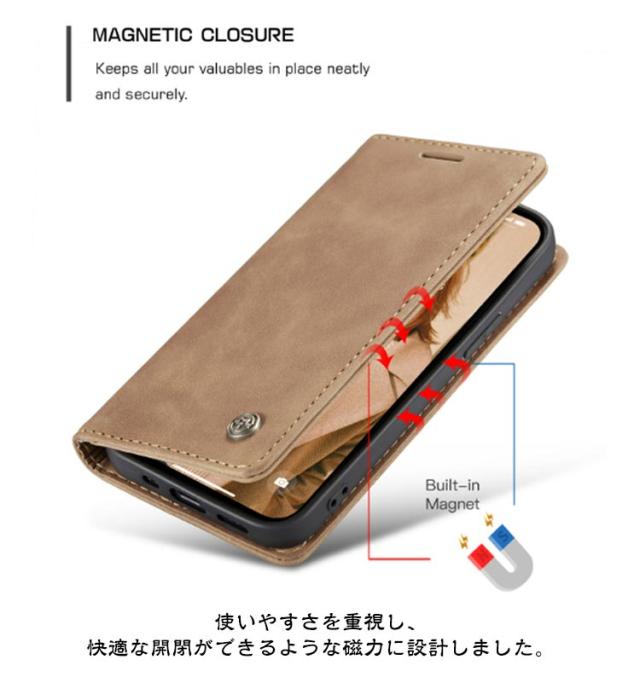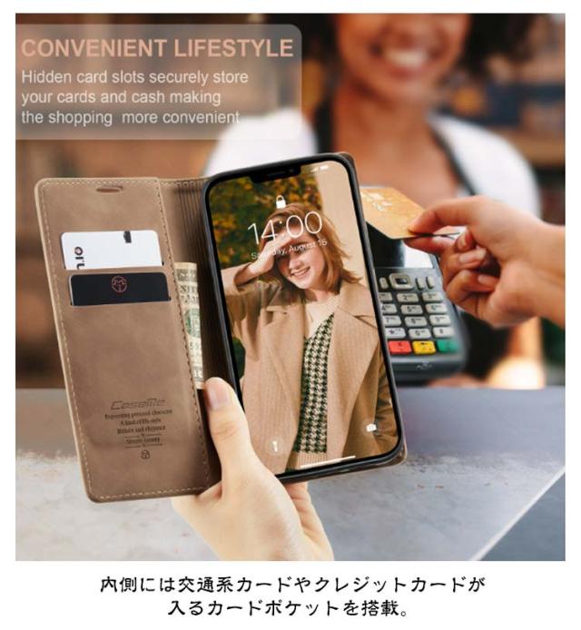 | 【対応機種】iPhone 【素材】PUレザー TPU 【セット内容】スマホケース(iPhone本体は同梱されておりません) 【特徴】 ポケットやバッグの中にもスッキリ収納できる薄型手帳ケース。 内側には交通系カードやクレジットカードが入るカードポケットを搭載。 それに、お札やレシートなどが収納できる大きめポケットが付いています。 お出かけ際に、これだけを持っていけば十分! スマホを横置きできるスタンド機能で長時間の動画視聴もらくらく!新幹線、飛行機の中での暇つぶしに最適です。 使いやすさを重視し、快適な開閉ができるような磁力に設計しました。 上品な質感のPUレザーを使用し、触り心地や耐久性も抜群。 カメラレンズ周囲の穴に段差を設けることによって、iPhoneの突出したレンズを保護。 ストラップホールを搭載しており、お気に入りストラップを付けられます。 | |