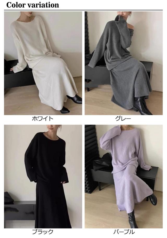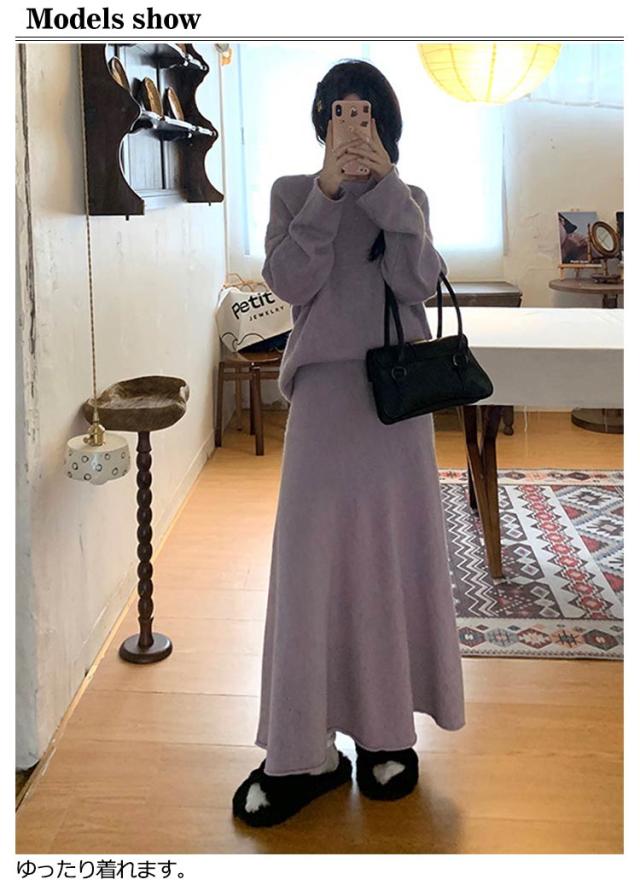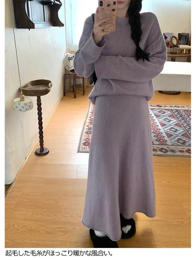 ニットセットアップ レディース 2点セット ニット セットアップ スカート 秋冬 秋 冬 ニットスカート ウエストゴム モヘア ボトムス トップス 長袖 ロング丈 マキシ丈 長袖 ぽわん袖 ポワン袖 送料無料 オフィス