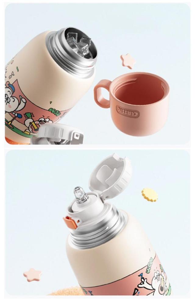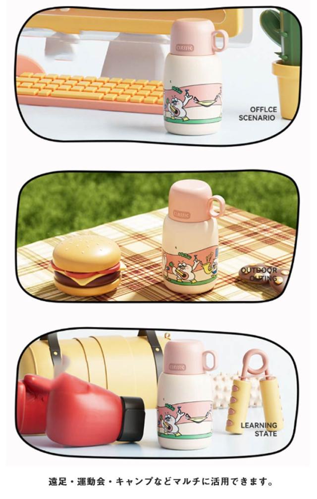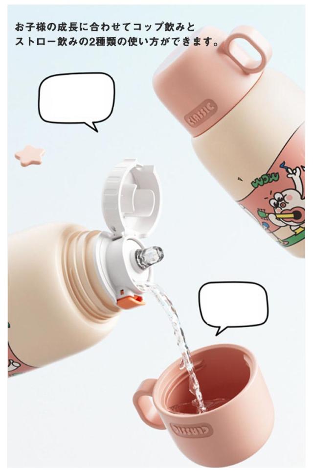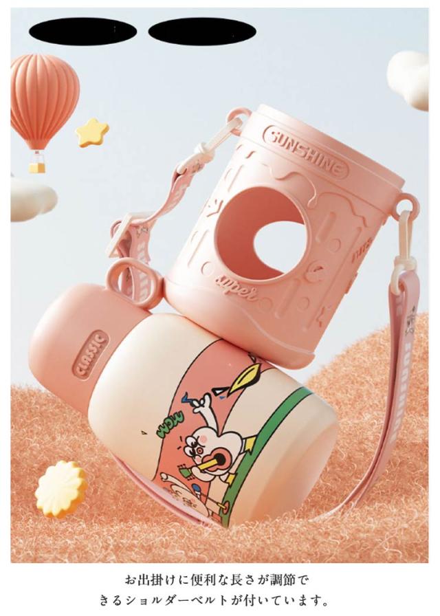 | 可愛いコップ付き水筒です。 ステンレス真空断熱構造でしっかり外気温を遮断、保温と保冷効果に優れています。 お子様の成長に合わせてコップ飲みとストロー飲みの2種類の使い方ができます。 お出掛けに便利な長さが調節できるショルダーベルトが付いています。 遠足・運動会・キャンプなどマルチに活用できます。 | |