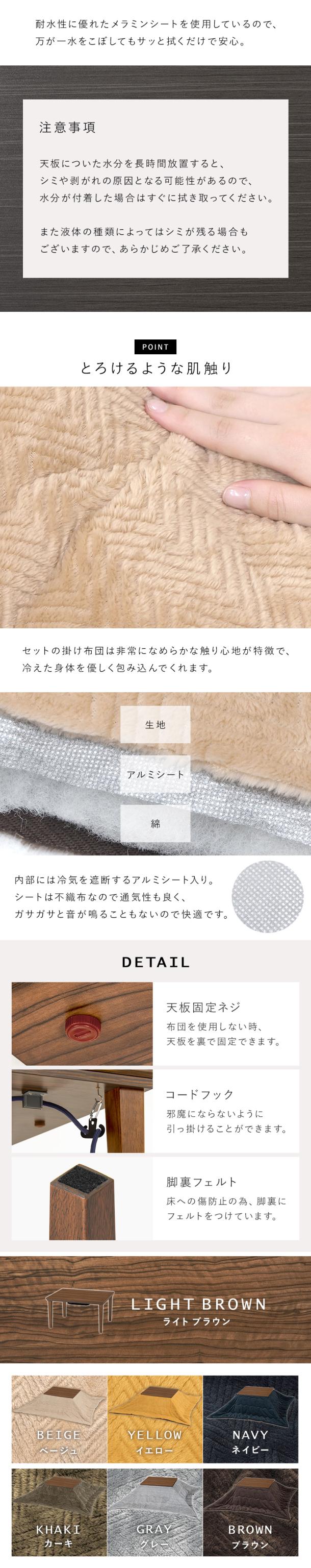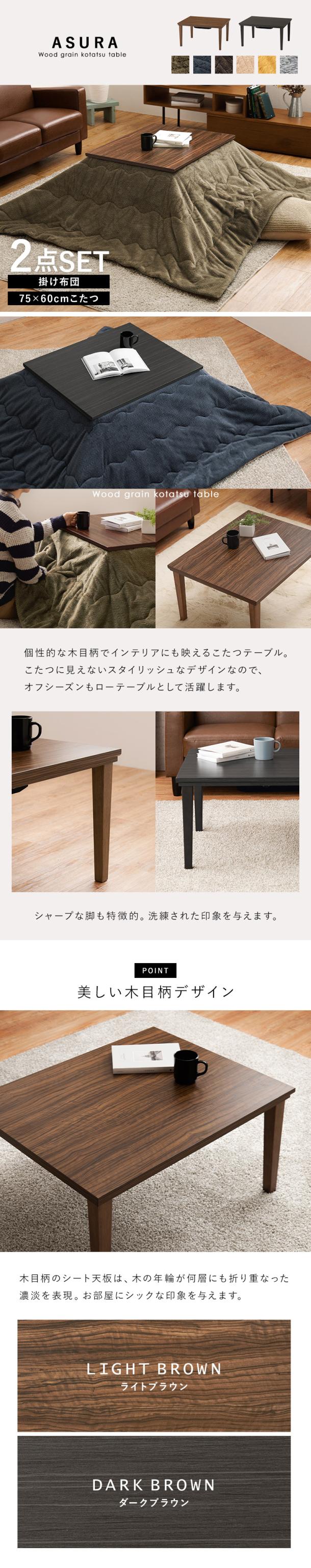 【2点セット】こたつテーブル+こたつ布団 75×60cm イエロー色 層状の木目柄 耐水 メラミンシート ライトブラウン天板 ASURA-PIQUE アスラピケ