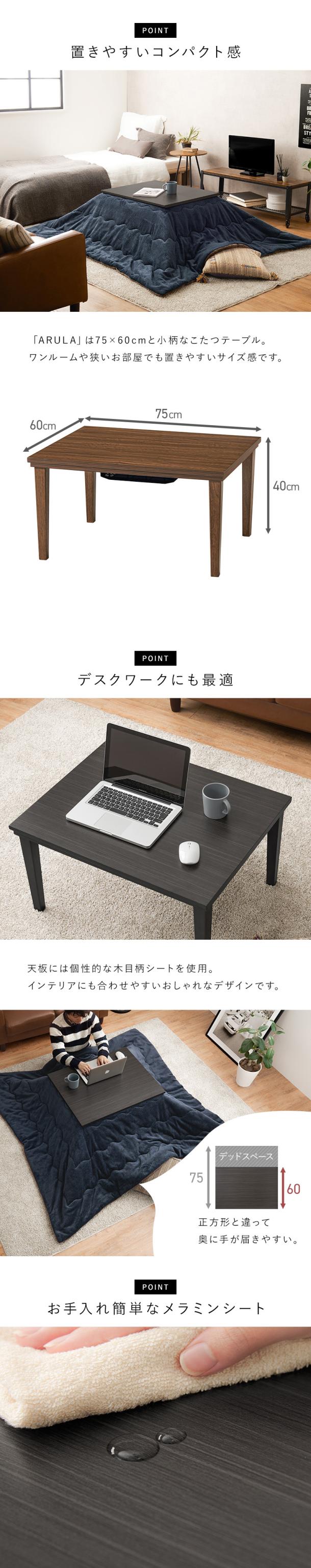 置きやすいコンパクト感。「一般的な75cm角の正方形こたつは場所を取る」という方にお勧めのサイズ。