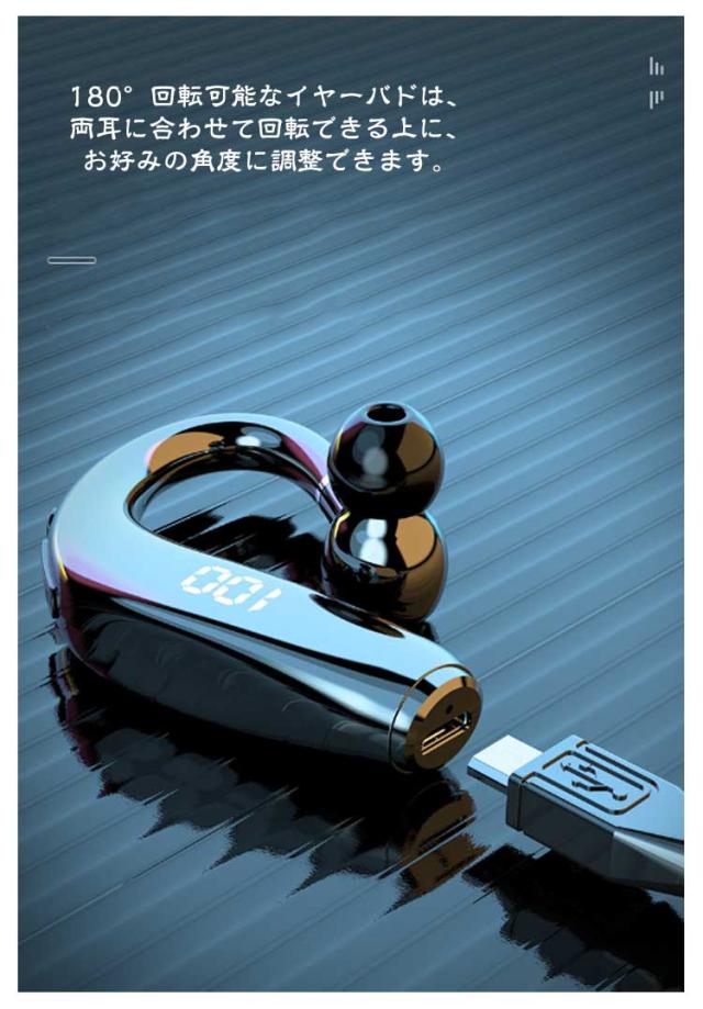 | 【Bluetooth5.3】【IPX5防水】【バッテリー残量表示】 180°回転可能なイヤーバドは、両耳に合わせて回転できる上に、お好みの角度に調整できます。 耳ラインに基づいた流線型の設計によって、左耳にも右耳にも快適な装着感をもたらします。 軽量で長時間装着しても痛感なし、耳に負担を掛けません、快適性も実用性もあります。 更にビジネスシーンや周りの状況に気を配りながらの作業には片耳で通話しながらメモを取ったり、PC入力するのにも重宝します。 不意に話かけられた際もスマートに対応できます。高性能バッテリ内蔵、連続通話時間最大16h! 無痛装着タイプで長時間の通話やチャットミーティングなどにオススメです! Bluetooth機能付きデバイスに対応しており、最大約10mの音声信号伝送が可能でコードを気にせずクリアな高音質サウンドが楽しめる。 ヘッドセット本体から、通話の各操作(着信を受ける・拒否・電話を切る・リダイヤルする)と音楽再生の各操作(再生・一時停止・音量調整・曲送り・曲戻し)ができます。 ノイズキャンセル機能を搭載していることで、ノイズを抑制し、クリアな通話ができます。 スポーツ中の汗や水しぶきに強い防滴仕様、スポーツに最適bluetoothヘッドセットです。 バッテリー残量はLEDディスプレイに数字で表示され、100%から1%まで刻みで、充電の状況も確認できます。 使用方法: 電源on:指示ライトが点灯するまで多機能ボタンを長押す 電源off:指示ライトが消えるまで多機能ボタンを長押す 電話を受ける :多機能ボタンを短押す 電話を切る:多機能ボタンを短押す 曲戻し:−ボタンを短押す 曲送り:+ボタンを短押す 音量+:+ボタンを短押す 音量−:−ボタンを短押す 電話を拒否する:多機能ボタンを2回押す 再生・一時停止:多機能ボタンを短押す | |