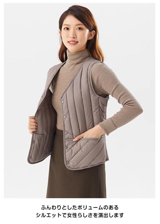 | 羽織るだけで体がぽかぽかになるフードダウンベスト ふんわりとしたボリュームのあるシルエットで女性らしさを演出します 軽量で暖かく、ノースリーブデザインなので家事や庭作業時に便利です シンプルデザインでカラー別で何枚持っても着回ししやすい便利なアイテム | |
