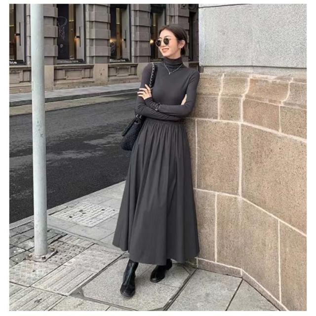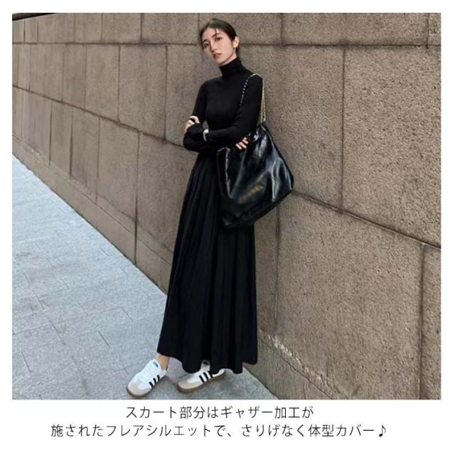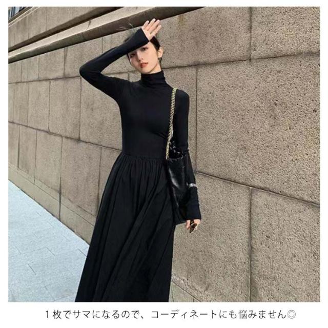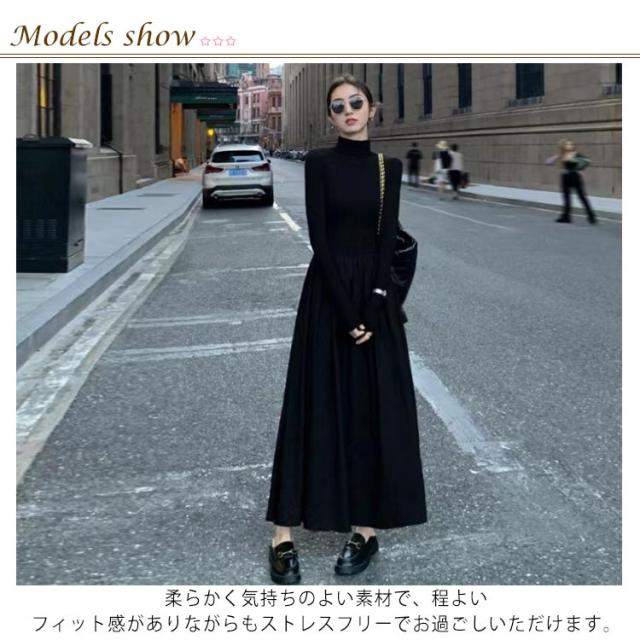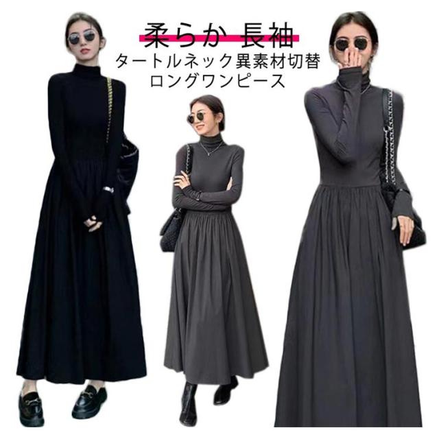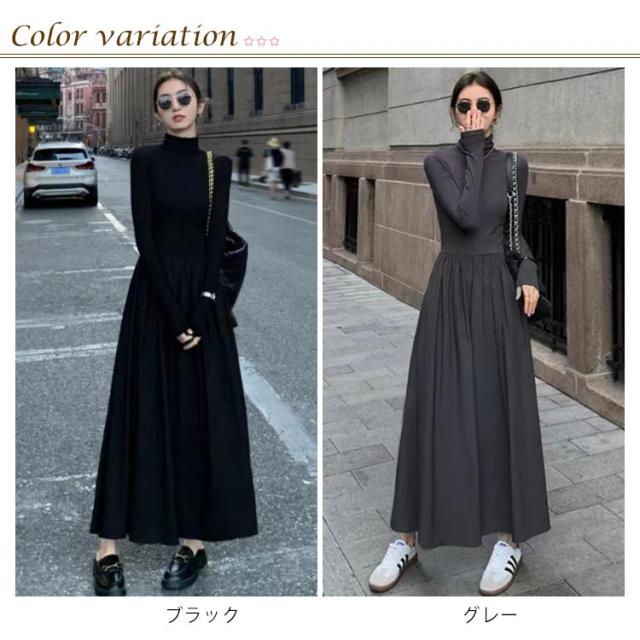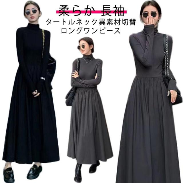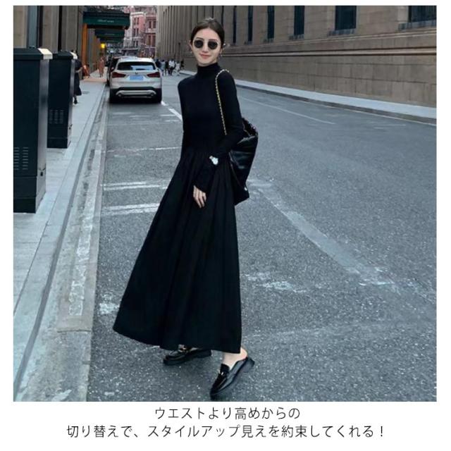 ハイネック 異素材 切替 ワンピース レディース 長袖 タートルネック ロング丈 ロングワンピース マキシワンピース ハイウエスト フレア ウエスト切替え 体型カバー 細見え 秋 冬 シンプル きれいめ オフィスカジュアル フェミニン 上品 おしゃれ オフィス 通勤 送料無料
