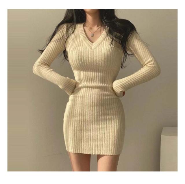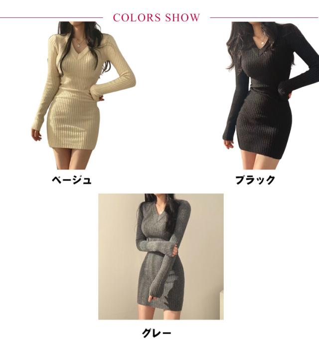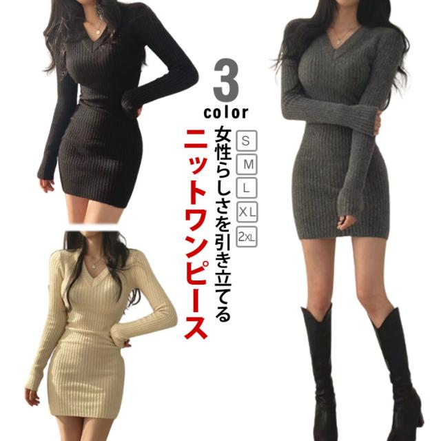 ニットタイトワンピース 韓国 ニットワンピース タイトワンピース Vネック レディース ワンピース ミニワンピース 秋冬 きれいめ 黒 長袖 ひざ上丈 リブ ニット おしゃれ 可愛い セクシー 上品 タイト パーティドレス 二次会 結婚式 OL