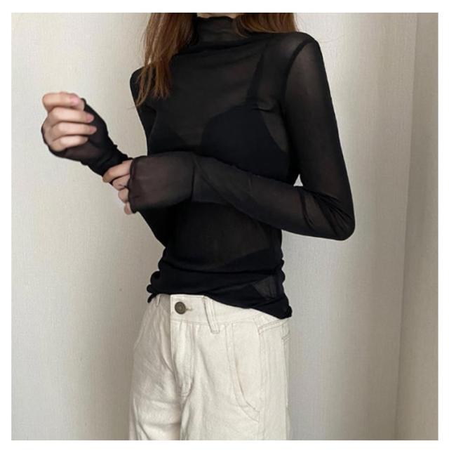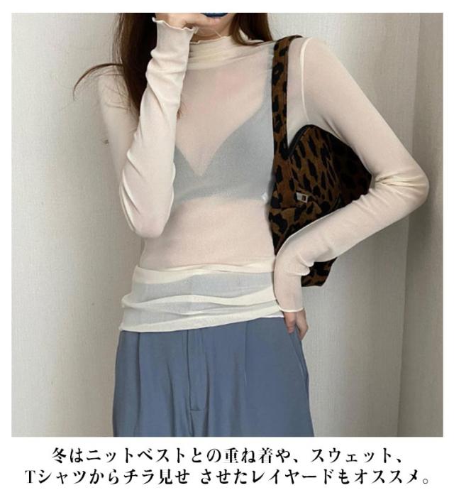 シースル シアートップス ハイネック フリル レース メッシュ 長袖 ブラウス 透け感 タートルネック レディース インナー カットソー tシャツ 薄手 重ね着 レイヤード 春 夏 秋 冬 シアーシャツ 20代 30代 40代