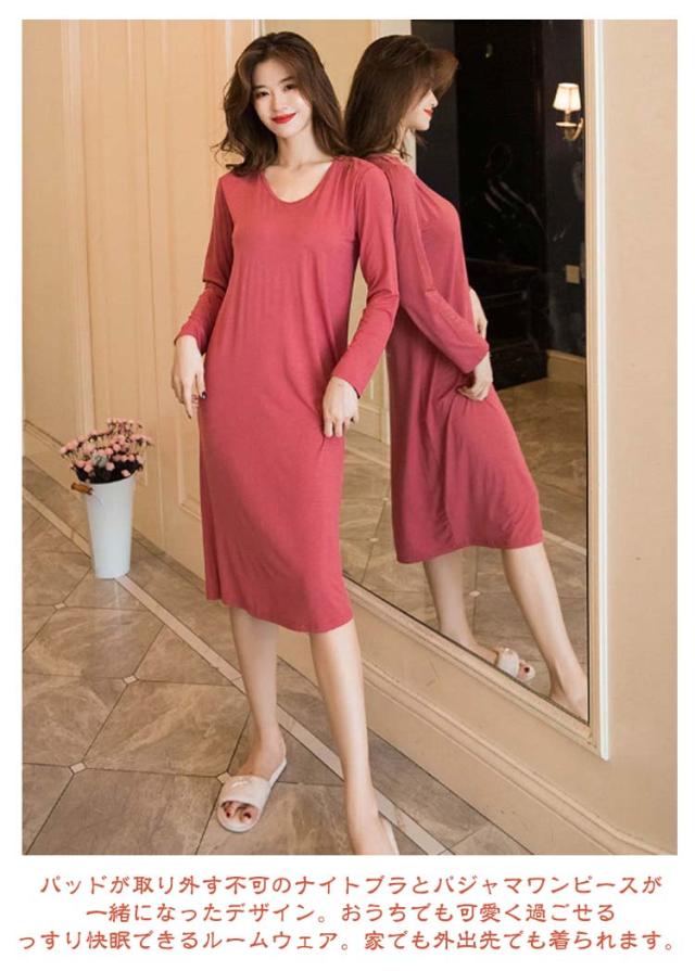 カップ付き ワンピース レディース 長袖 Uネック ボーダー ロング丈 パジャマ ブラカップ付き 秋 冬 春 ワンピース ルームウェア ナイトウェア 寝間着 部屋着 大きいサイズ ランジェリー リラックス シンプル ゆったり 送料無料