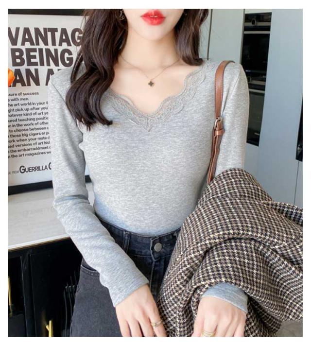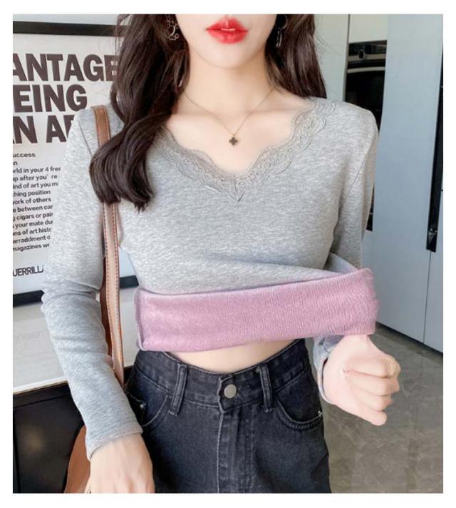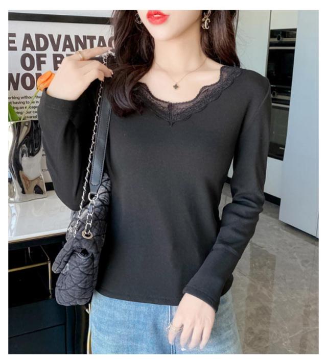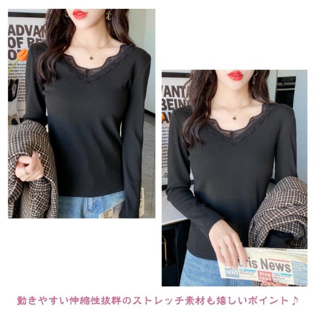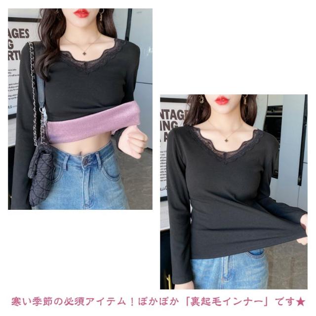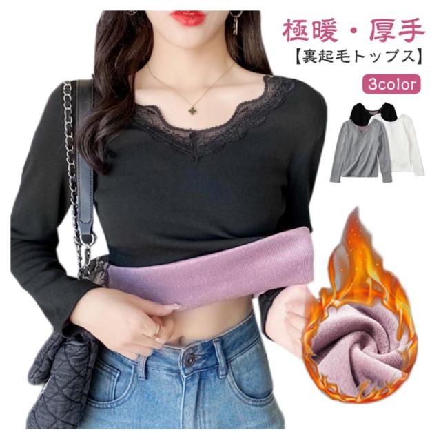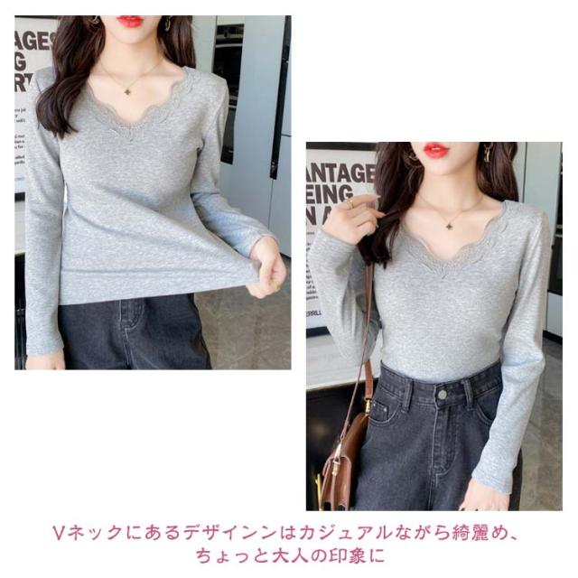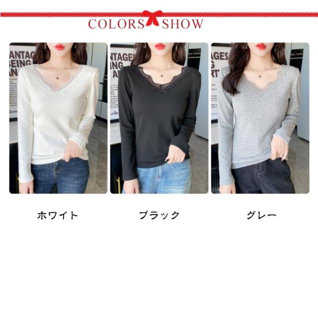 裏起毛 カットソー レース Vネック あったかインナー 極暖 暖かい トップス レディース 長袖 インナー レーストップス 見せるインナー ブラック ホワイト グレー 黒 白 秋冬 あったか 肌着 重ね着 プルオーバー おしゃれ 保温 防寒 ストレッチ ぽかぽか