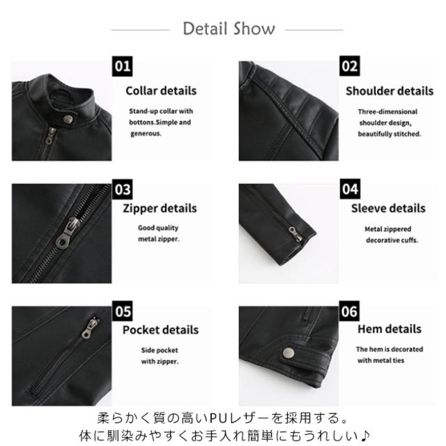 | ほどよい艶のしっとりした質感が品格漂うレザージャケット スカート・デニム合わせるアイテムでスタイルの雰囲気が変わる優秀アウター。 柔らかく質の高いPUレザーを採用する。体に馴染みやすくお手入れ簡単にもうれしい♪ 定番デザインなのでカジュアルコーデはもちろん マニッシュコーデ、フェミニン系の甘辛MIX・ブリティッシュスタイルにもピッタリ! 大きいサイズ4XLにも対応、XS S M L XL 2XL 3XL 4XLよりお選びいただけます。 | |