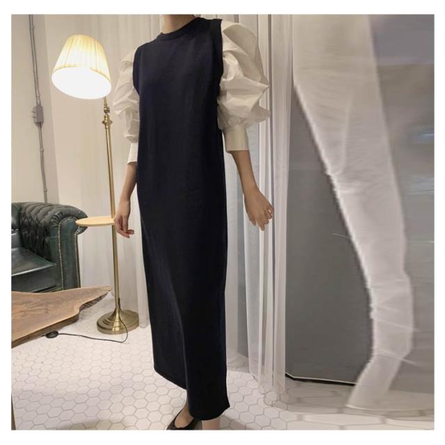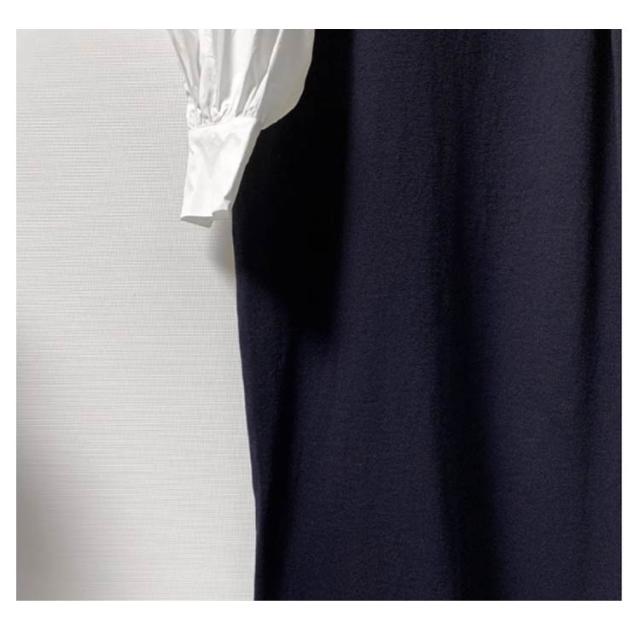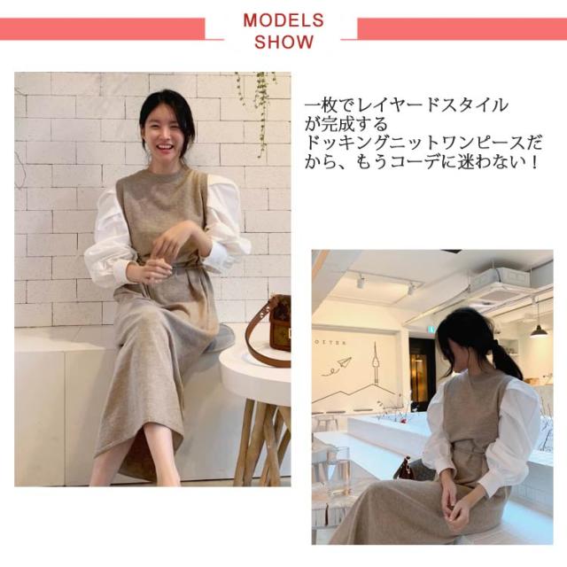 ドッキングワンピース レディース 長袖 シャツドッキングニットワンピース レイヤード風 リブニット 異素材 ロングワンピース ドッキング ボリューム袖 袖コンシャス ワンピース ワンピ ドッキングワンピース 大人のこなれ感