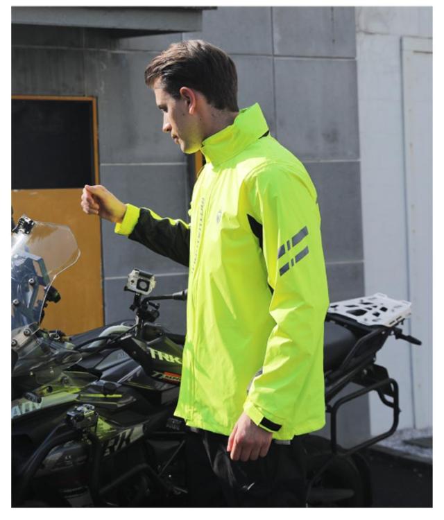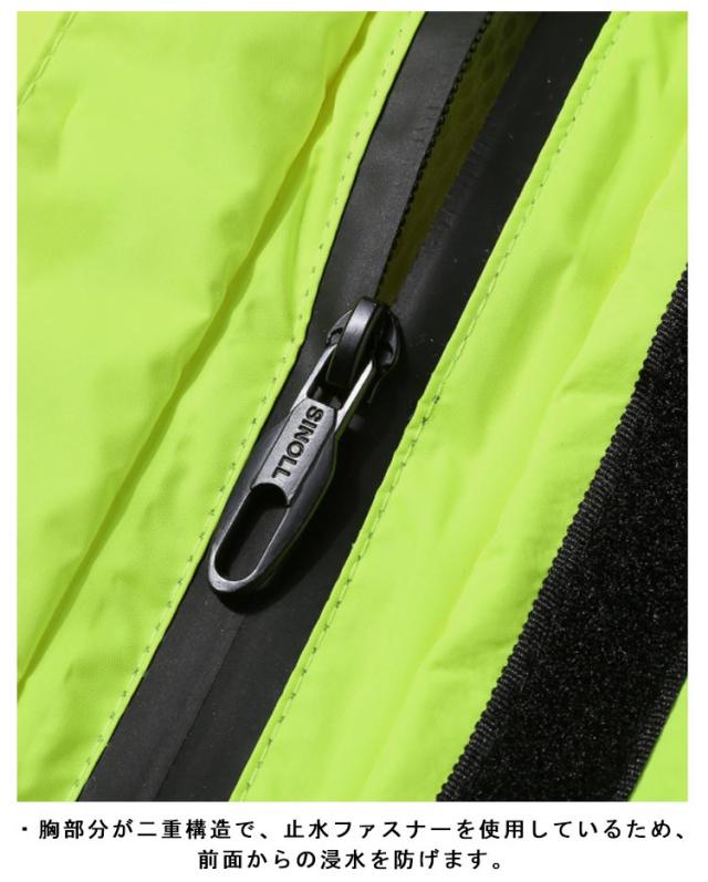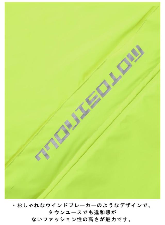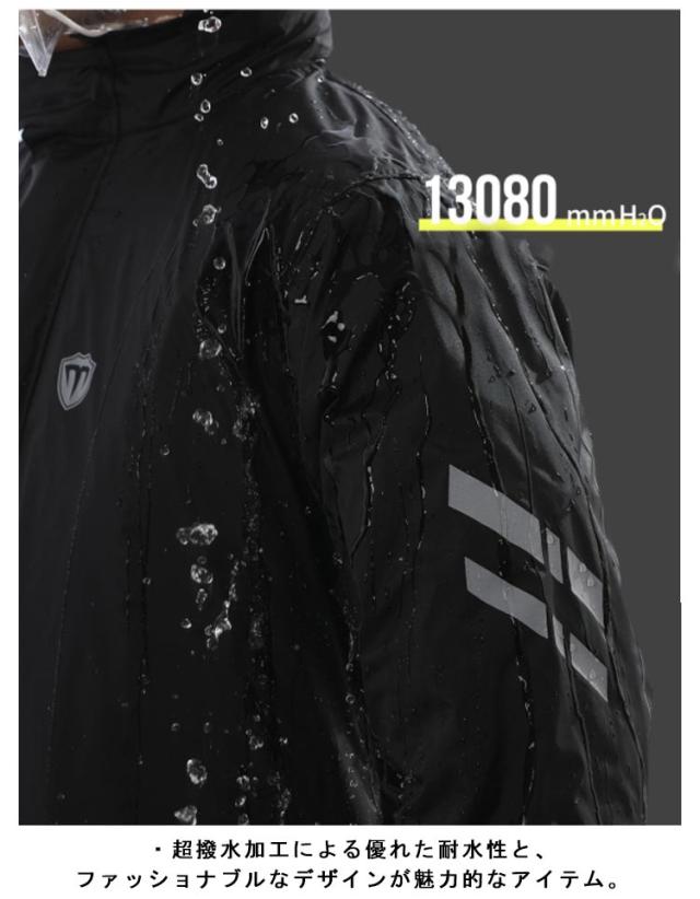 | ・雨の日以外も着たくなるファッション性の高いレインスーツ♪ ・超撥水加工による優れた耐水性と、ファッショナブルなデザインが魅力的なアイテム。 ・おしゃれなウインドブレーカーのようなデザインで、タウンユースでも違和感がないファッション性の高さが魅力です。 ・胸部分が二重構造で、止水ファスナーを使用しているため、前面からの浸水を防げます。 ・総裏メッシュ付きなので、雨でもムレにくく快適。 ・腕・胸元・背中に反射テープを配置することで視認性を高め、薄暗い雨の中でも安全に走行できます。 | |