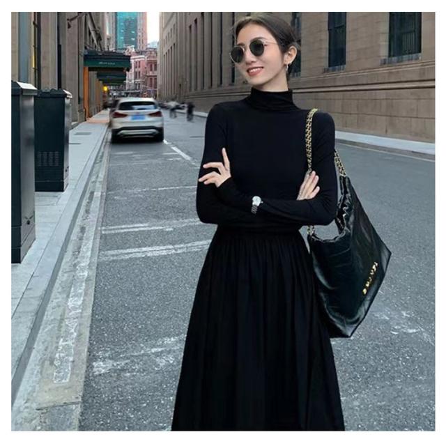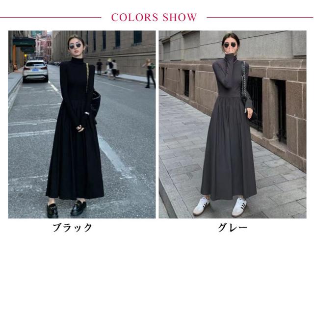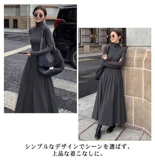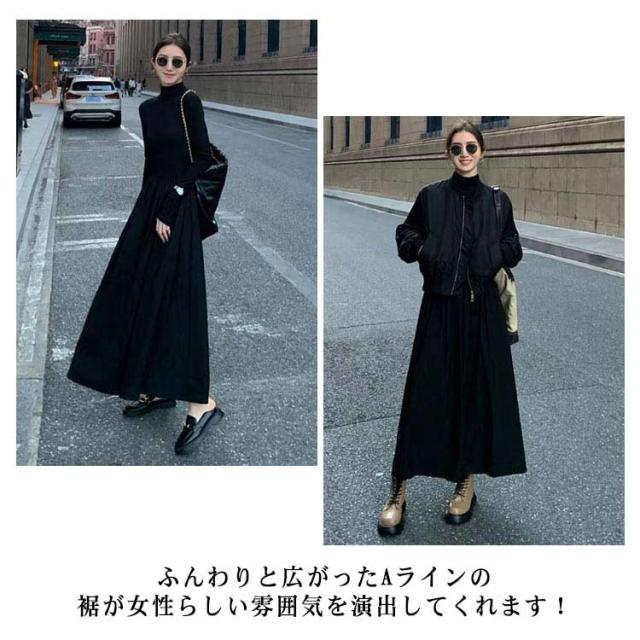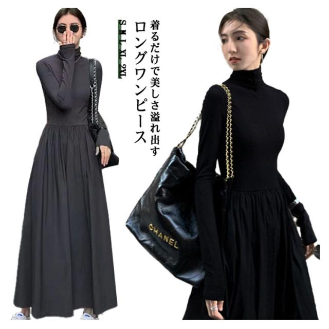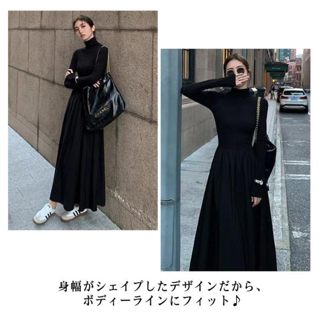 マキシワンピース Tシャツワンピース ハイネック マキシ丈 フレア レディース タイトワンピ ロングワンピース タートル マキシ フレアワンピース Aライン タートルネック フォーマル シンプル きれいめ 小顔 ブラック 黒 秋 冬 お呼ばれ