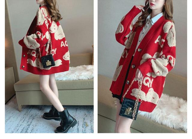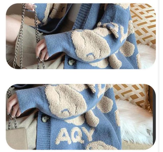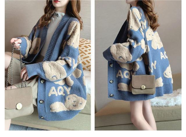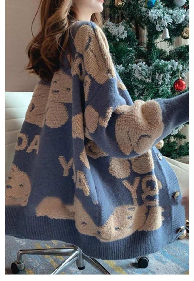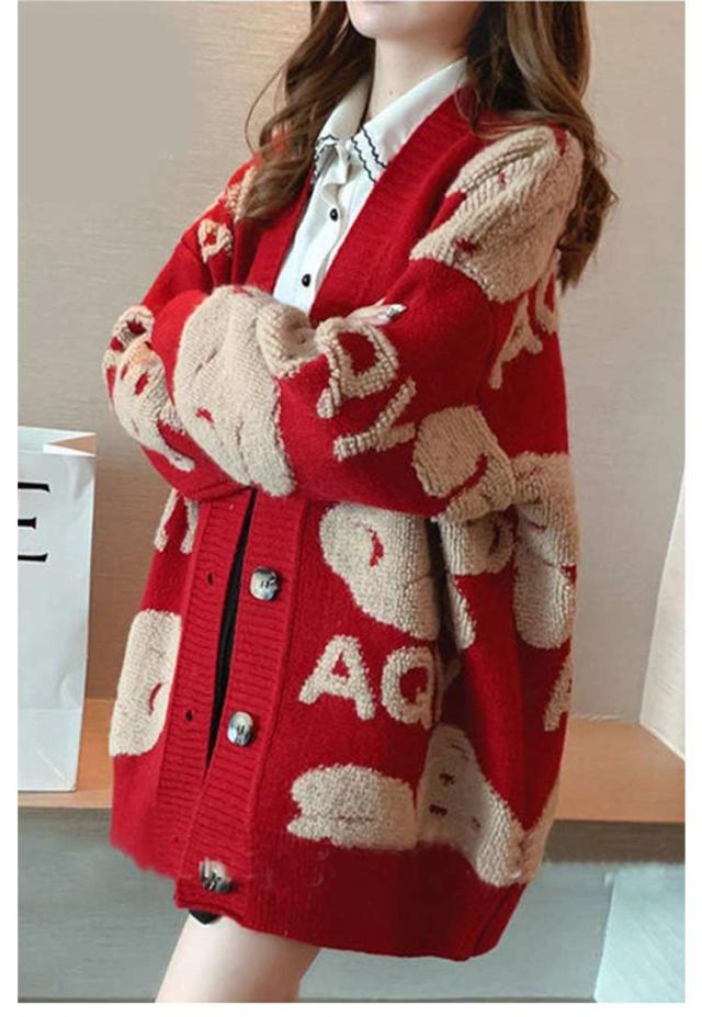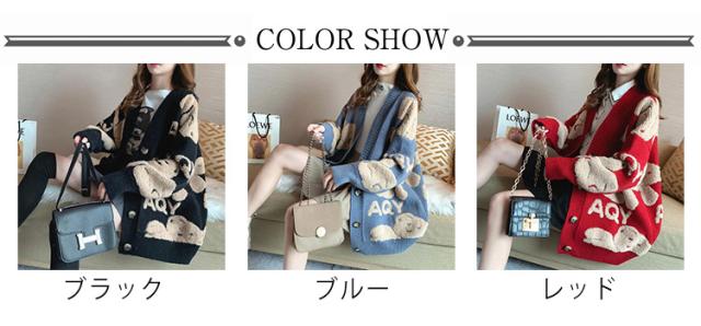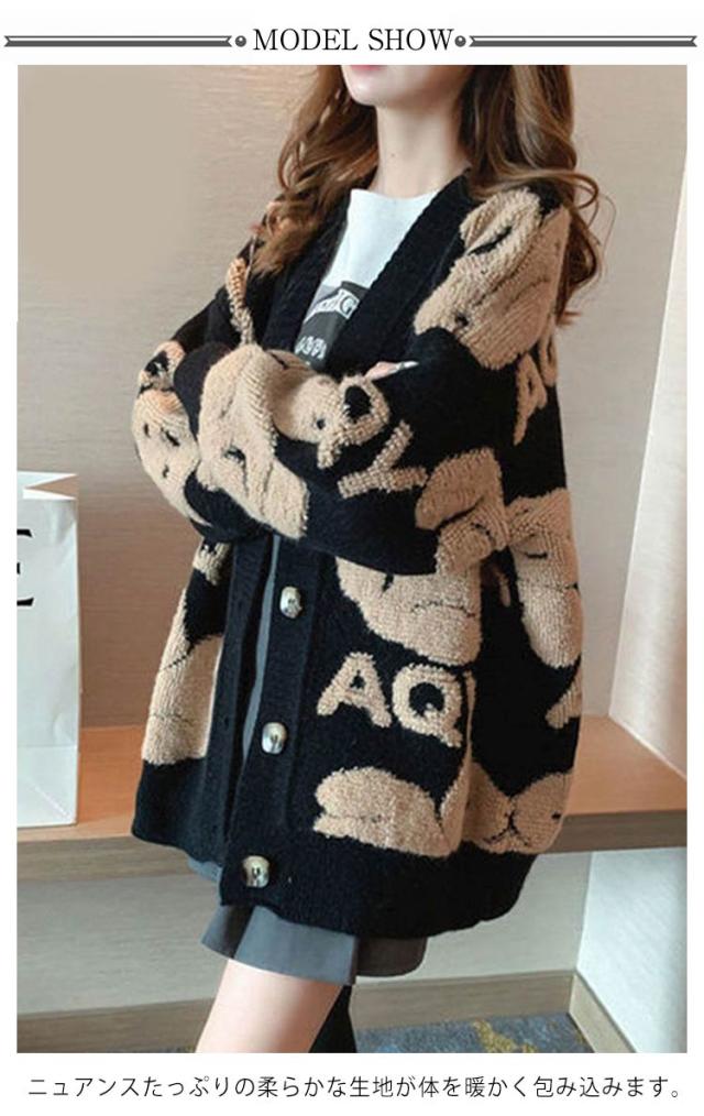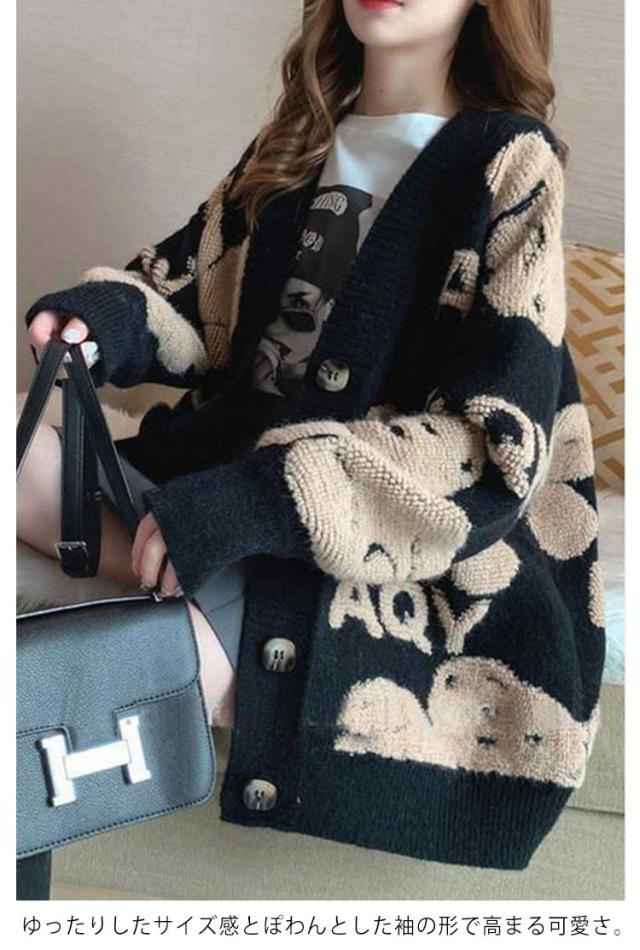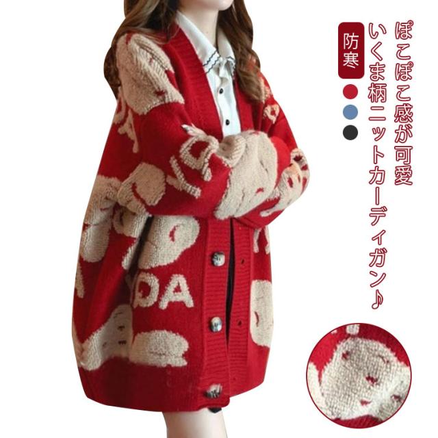 くま柄 ニット カーディガン ボア 生地 レディース 秋 冬 長袖 ニットカーディガン セーター アウター 羽織 前開き 厚手 Vネック ボタン ニットカーデ ゆったり 黒 ブラウン レッド くま 総柄 通勤 通学 防寒 暖かい お洒落 かわいい ざっくり 送料無料