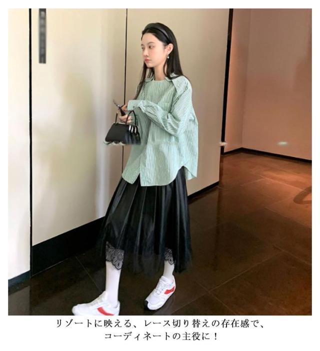 レース切り替え フレアスカート ロング スカート レザースカート プリーツスカート ミモレ丈 Aライン スカート フェミニン ハイウェスト 膝下丈 お呼ばれ エレガント かわいい 秋冬 S M L