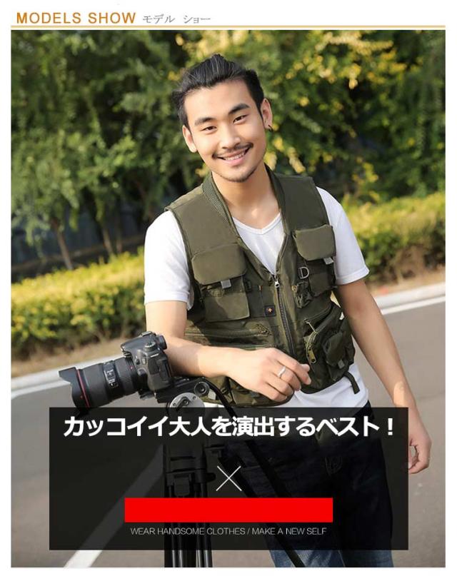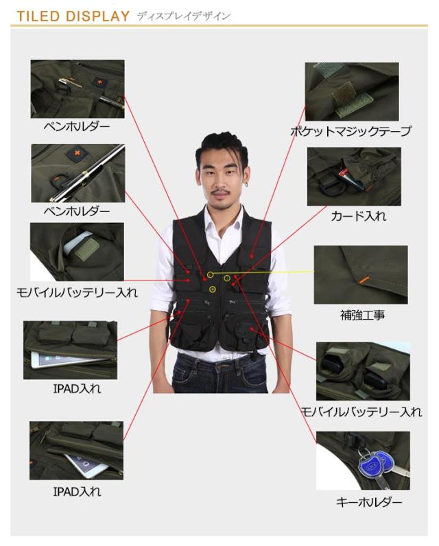 | 新作の多機能のベストの新登場! カッコイイ大人を演出するベスト! マルチポケットはオシャレで、機能性もバツグン! アウトドアに最適なアイテム! | |