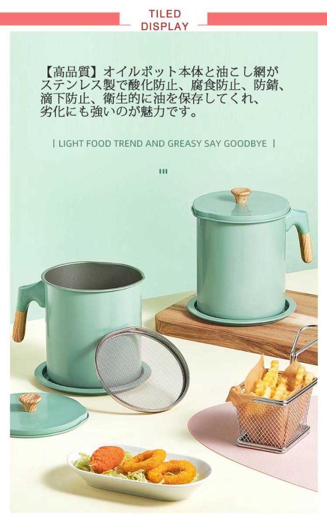 | 【高品質】オイルポット本体と油こし網がステンレス製で酸化防止、腐食防止、防錆、滴下防止、衛生的に油を保存してくれ、劣化にも強いのが魅力です。丈夫で耐食性に優れたステンレス製で耐久性も強くて、分体式の設計でお手入れが簡単です。シンプルなデザインでキッチンに並べても邪魔にならない コンパクトなサイズが魅力のオイルポット。 【安全】滑らかな取っ手はオイルポット本体との距離を取って直接接触の回避ができ、火傷しにくい、簡単に握ることができます。ステンレス製の受け皿は油が垂れてしまっても受け皿が受けてくれ、油が竈の天板を汚す心配はありません。熱くなったオイルポットを置くのにも最適です。 【実用性】 注ぎ口が広いので鍋に油を注ぎやすく、油こしには細目の網を使用し、目詰まりしにくく食用油を調理用油から分離し、健康的で再利用可能。取り外し可能なカバーは、ほこりや虫を防ぎ、衛生的です。 | |