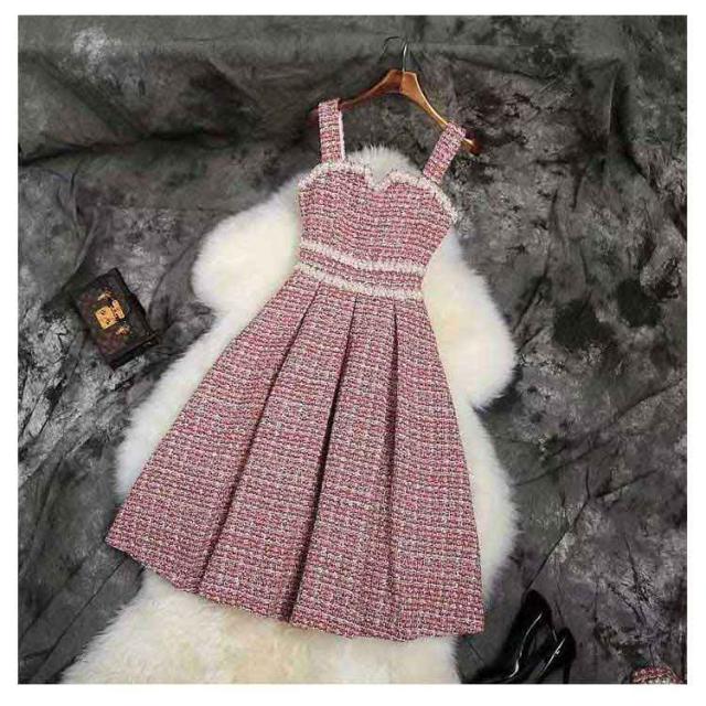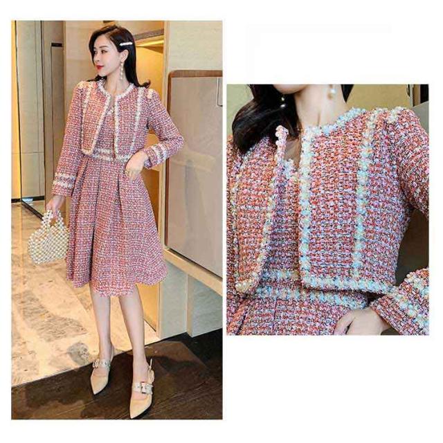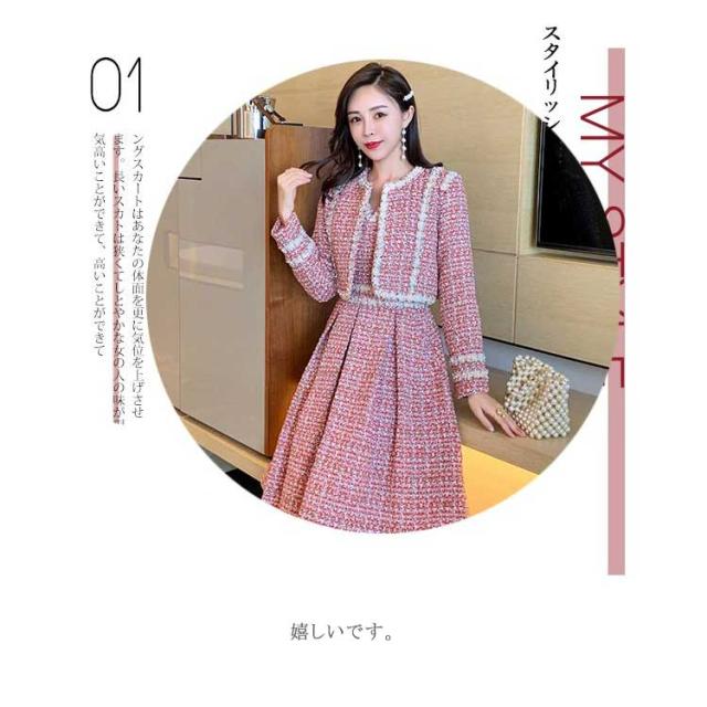 ツイード ワンピース セットアップ 韓国 ジャケット 七五三 ママ おしゃれ 母親 服装 親 スーツ 同窓会ドレス 卒業式 入学式 卒園式 入園式 成人式 セレモニーワンピース 春 秋 冬 長袖 レディース ジャンパースカート ジャンスカ パール ロング ピンク 80年代風