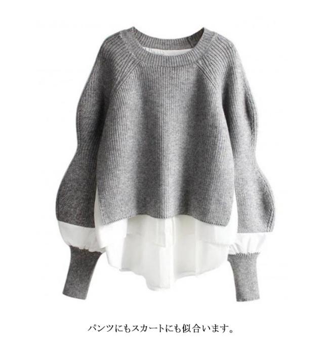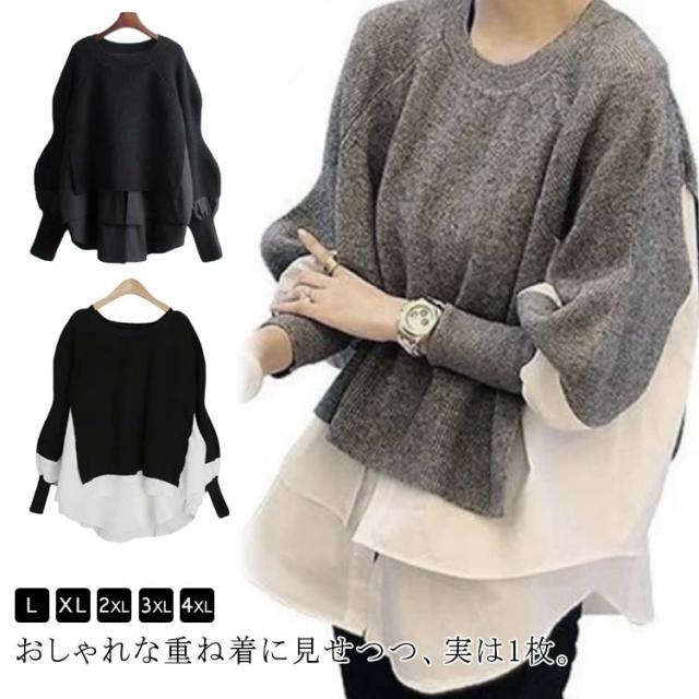 ドッキングニット ニット セーター レイヤード 重ね着風 ドッキング 長袖 プルオーバー 異素材 切り替え フェイクレイヤード ゆったり 体型カバー フェミニン オフィス きれいめ おしゃれ 大きいサイズ 秋 冬