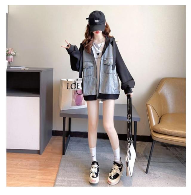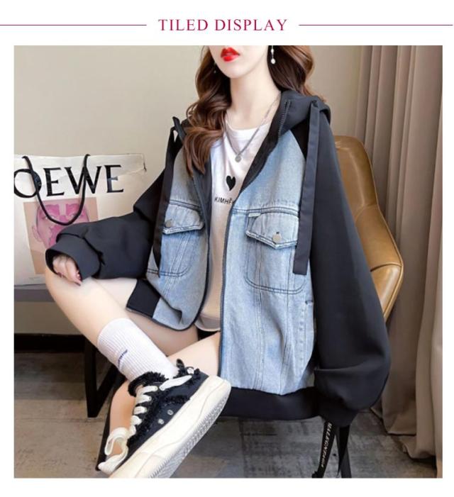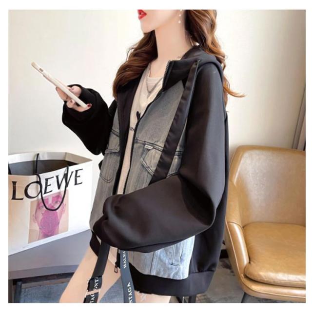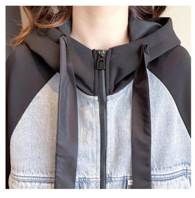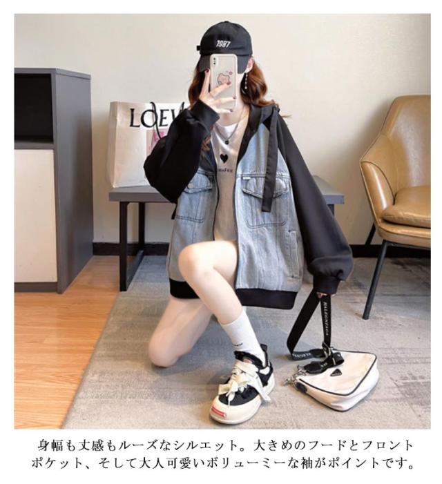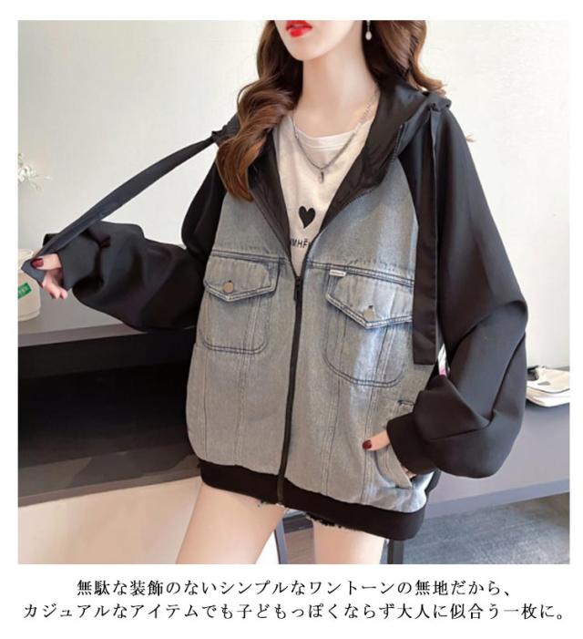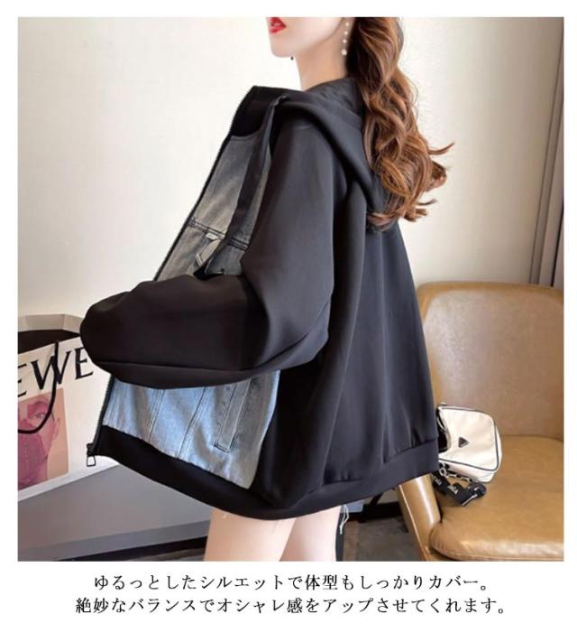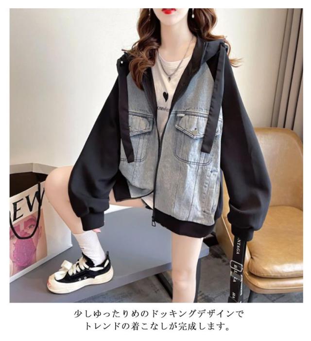 異素材切替デニムパーカー フード付き パーカー フーディー レディース スウェット トップス トレーナー 長袖 デニム ジャケット風 スウェット トレーナー 異素材 ドッキング フードパーカー ボリュームスウェット フーディーパーカー
