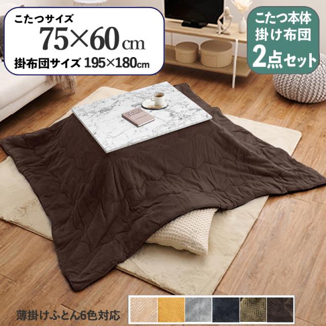【2点セット】こたつテーブル+こたつ布団 75×60cm ブラウン色 長方形 マーブルホワイト 大理石柄 耐水 メラミンシート コンパクト ワンルームこたつ AURA アウラ